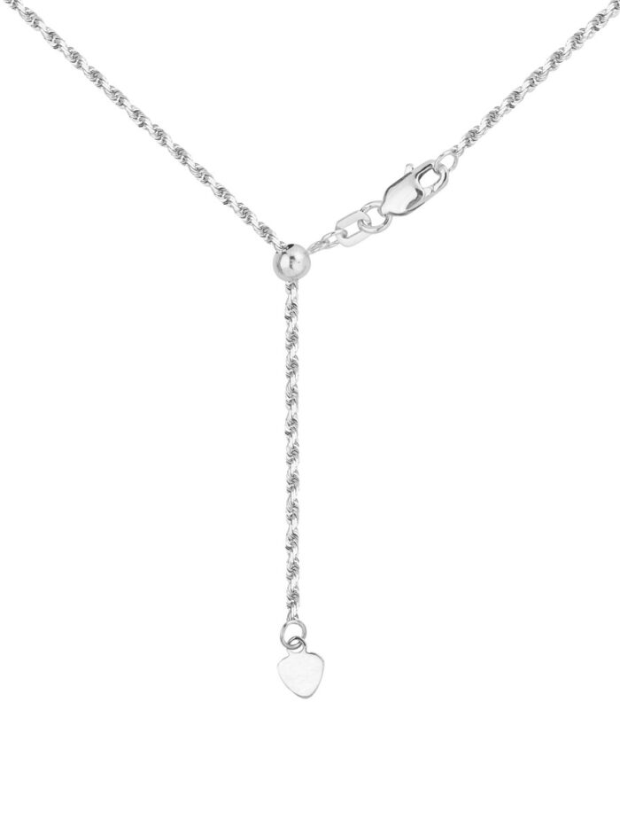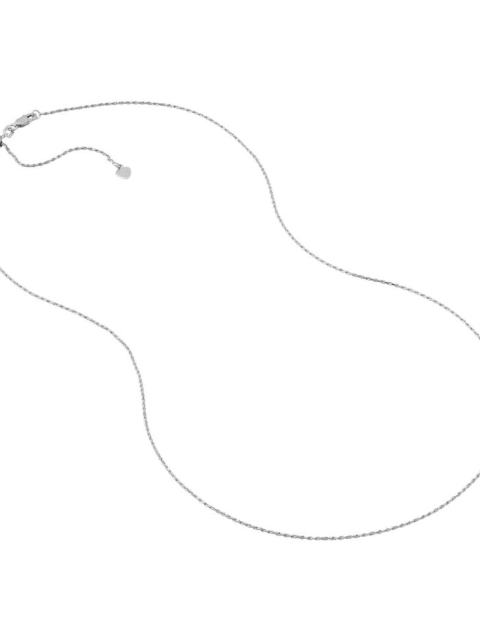 This 14K White Gold Rope Chain Necklace exudes timeless sophistication with its intricate rope-like design. The 1.05mm chain is crafted with meticulous attention to detail, showcasing a lustrous finish. The fluid silicone slider bead allows for easy length adjustment, ensuring the perfect fit for any occasion. Securely fastened with a lobster clasp, this necklace is both stylish and reliable.