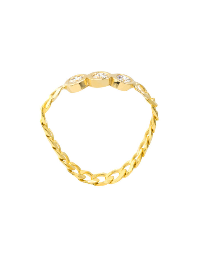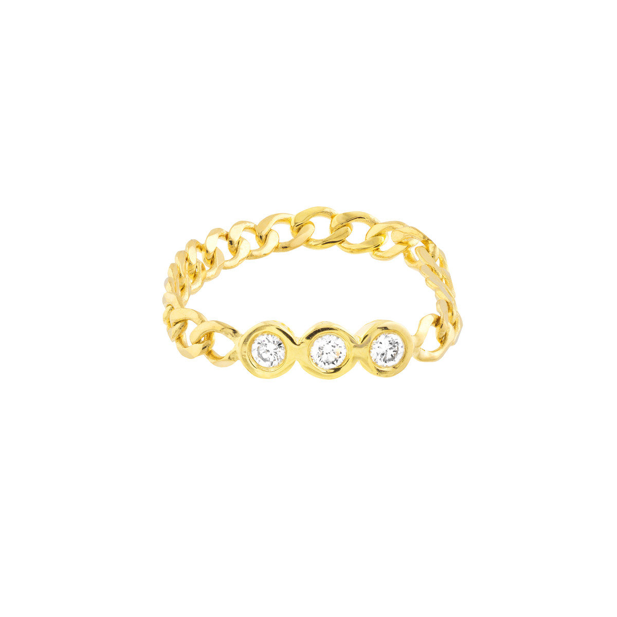 This 1/10tcw diamond trio curb chain ring is a timeless statement piece. The classic curb chain design is expertly paired with three sparkling round bezel-set diamonds, adding a touch of contemporary elegance. Crafted from lustrous 14K yellow gold, this ring is both durable and beautiful. The ring is available in size 6 and makes a perfect gift for any occasion.