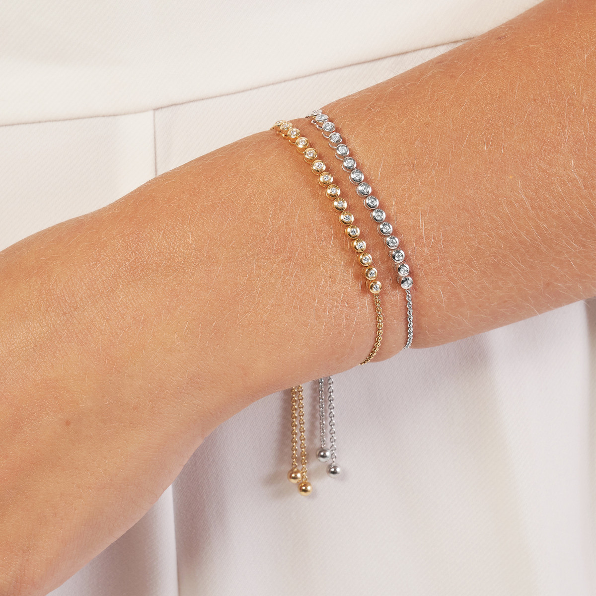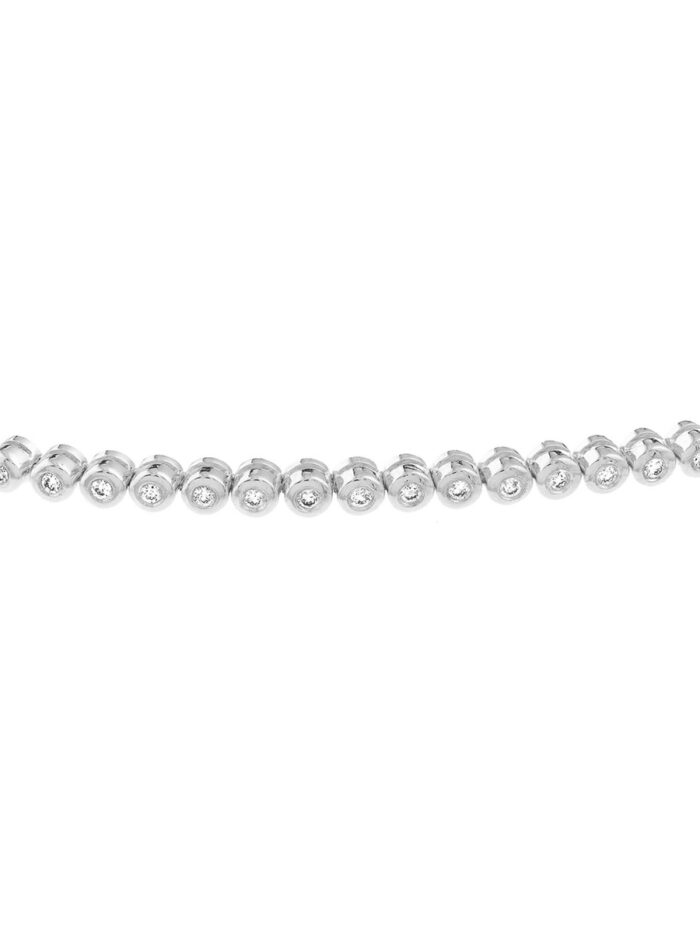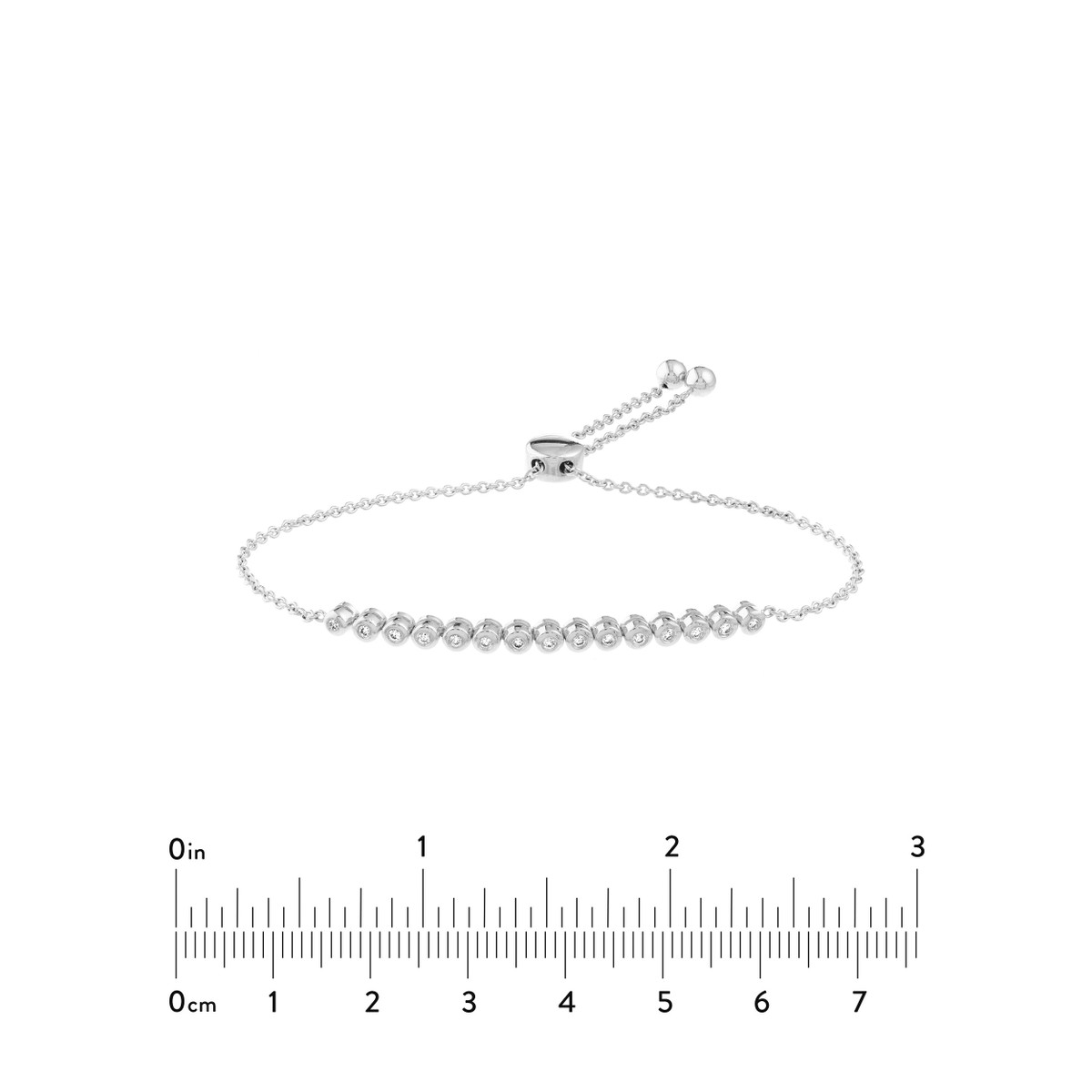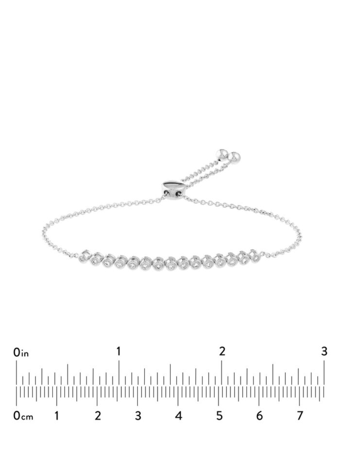 Add a touch of timeless elegance to your wrist with this stunning 1/5ctw Diamond Bezel Tennis Bolo Bracelet in 14K White Gold. This dainty bracelet features a row of sparkling diamonds set in a secure bezel setting, creating a brilliant and eye-catching look. The bolo clasp adds a touch of modern sophistication, making it the perfect piece to dress up any outfit.