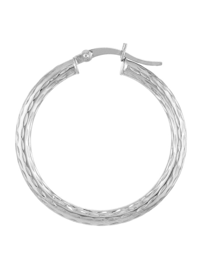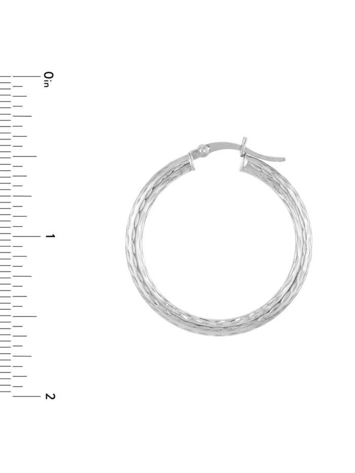 Shine bright with our 10K White Gold 3x30mm Diamond Cut Hoop Earrings. Featuring a dazzling diamond-cut design, these hoops catch the light with every movement, adding a touch of sparkle to any outfit. Crafted from lustrous 10K white gold, these earrings are both elegant and durable. The secure hinged closure ensures they stay comfortably in place all day long.