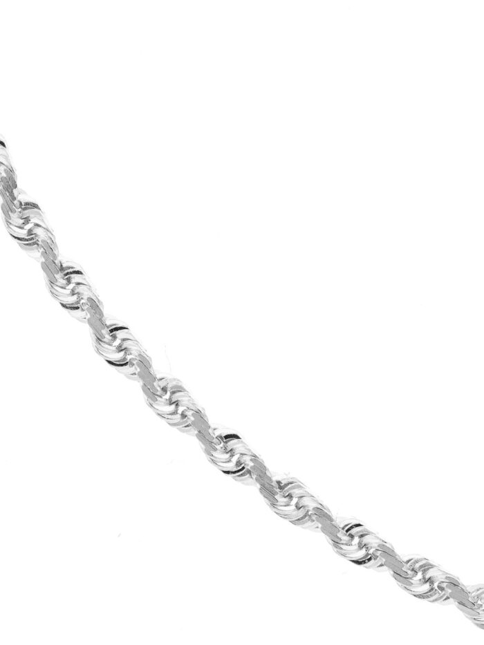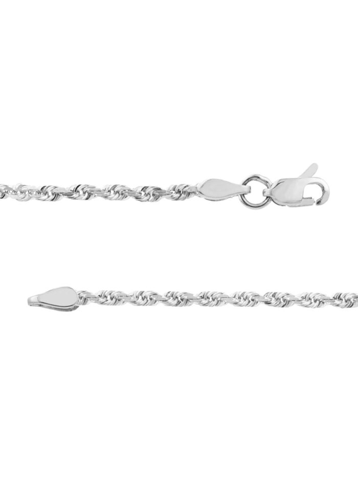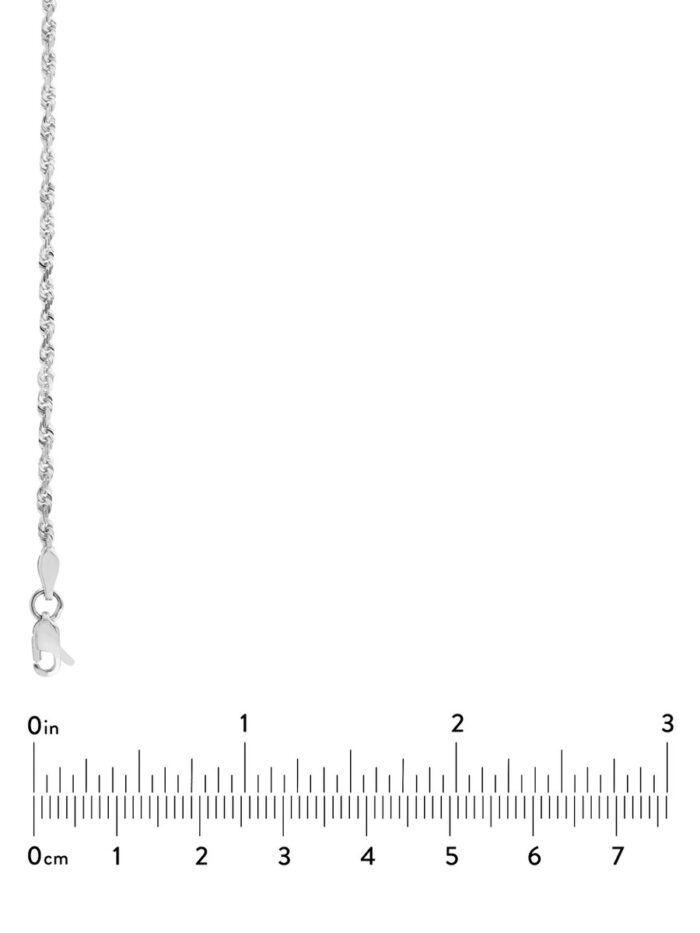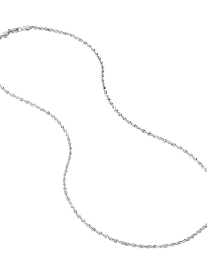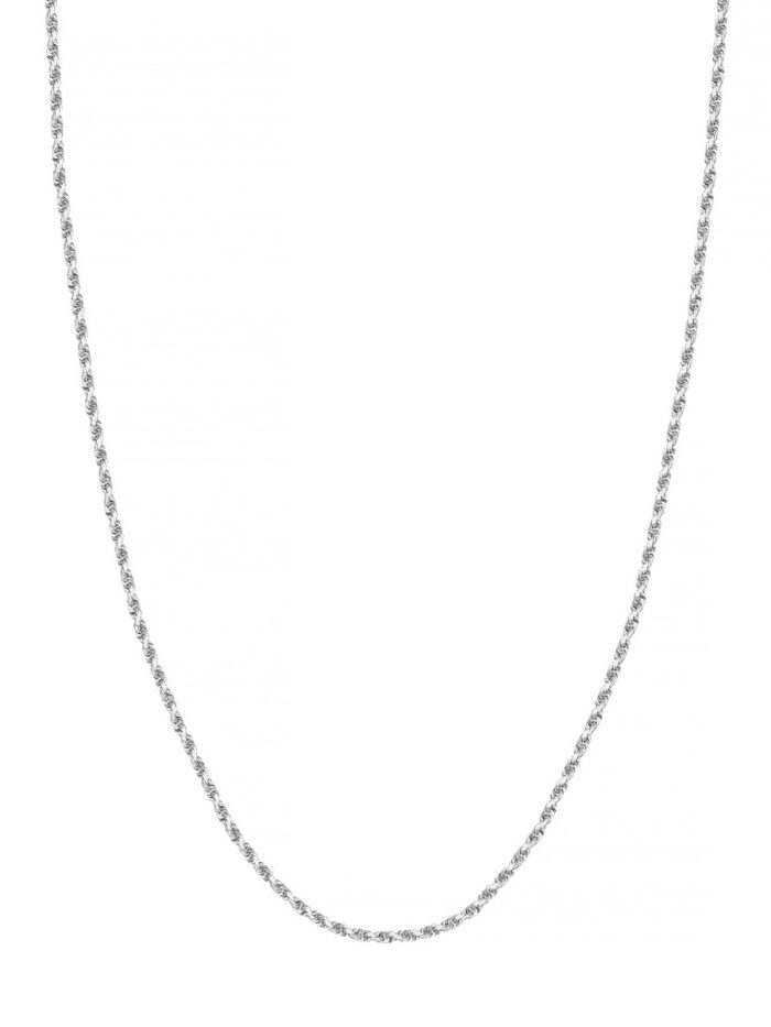 This exquisite 10K white gold diamond-cut rope chain exudes timeless elegance. The intricate diamond-cut design catches the light beautifully, adding a touch of sparkle to any outfit. The secure lobster clasp closure ensures a comfortable and secure fit. At 16 inches long, it’s the perfect length for layering or wearing as a statement piece on its own.