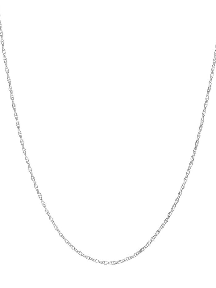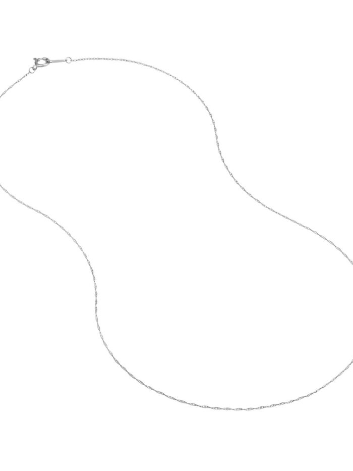 Embrace effortless sophistication with the 10K White Gold Pendant Rope Chain. Crafted from lustrous white gold, this delicate chain measures 0.8mm in width and 18 inches in length, featuring a secure spring ring closure. The graceful rope-link design adds a touch of elegance and movement, making it the perfect foundation for pendants or a stunning standalone piece.