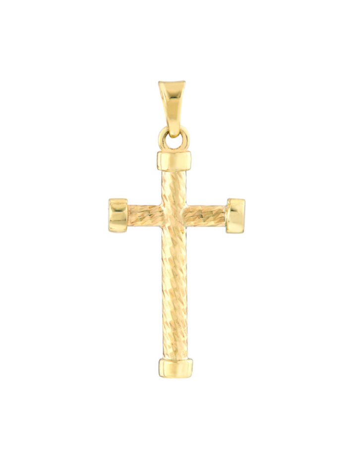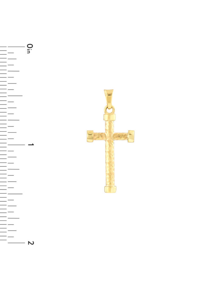 Make a statement with this unique 11mm Double Sided Twisted Design Cross pendant. Crafted from gleaming 10K yellow gold, its D/C cut adds a touch of sparkle. The pendant features a bail closure for easy attachment to your favorite chain.