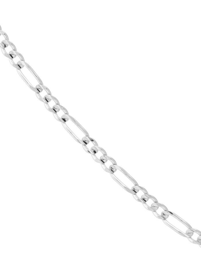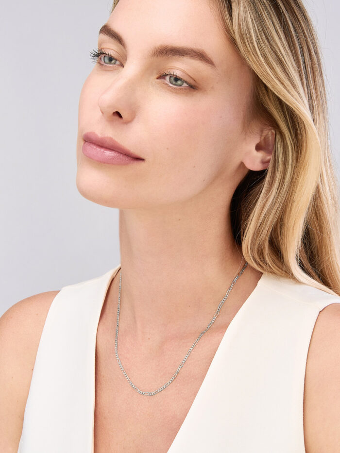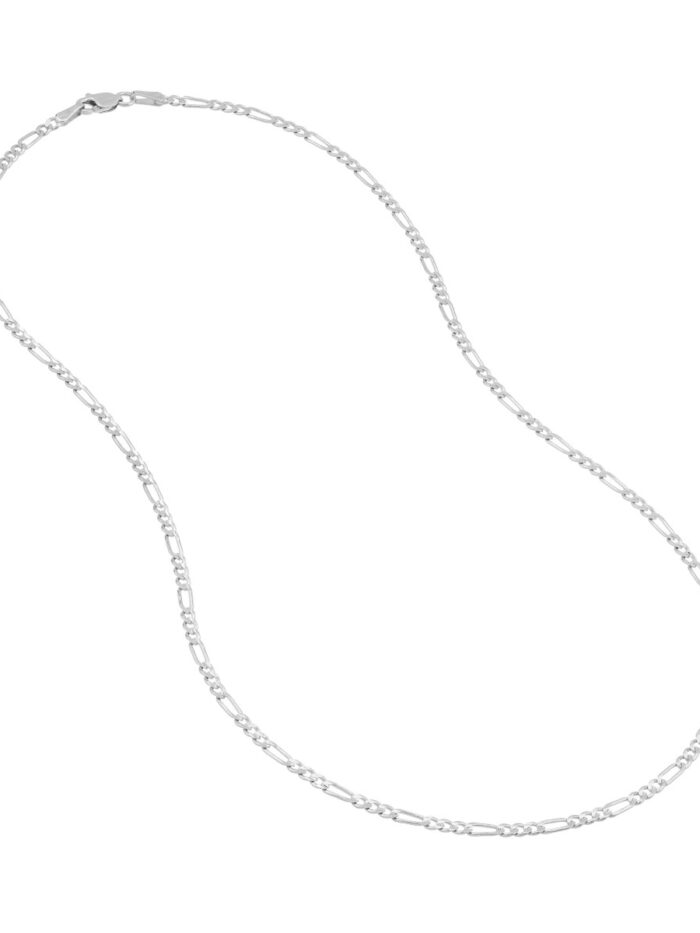 Experience understated luxury with this elegant 14K white gold Figaro chain. Its classic design and intricate links make it a timeless piece that complements any style. Crafted with precision, the chain features a secure lobster closure for added peace of mind. The 16-inch length allows for versatility, whether worn solo or layered with other necklaces.
