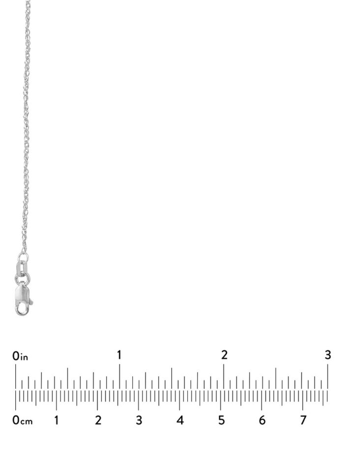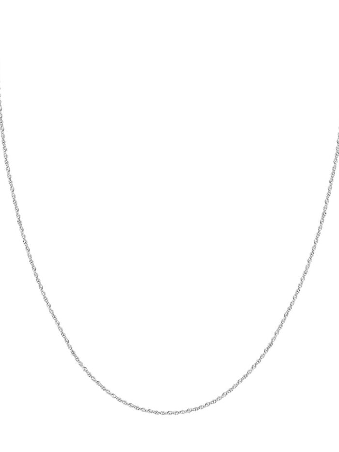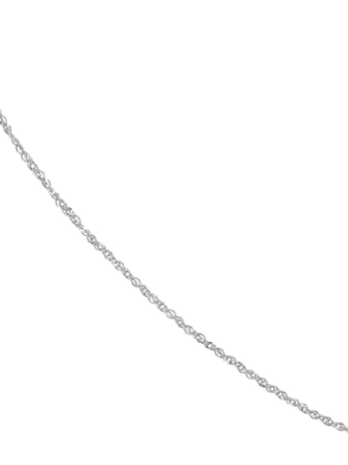 Experience luxurious style with this stunning 1.37mm Sparkle Singapore Chain made from gleaming 14K white gold. The intricate Singapore chain pattern is designed to shimmer and catch the light, adding a touch of elegance to any ensemble. The secure lobster lock closure ensures your pendant stays safely in place. At 16 inches in length, this chain complements a variety of necklines and looks.