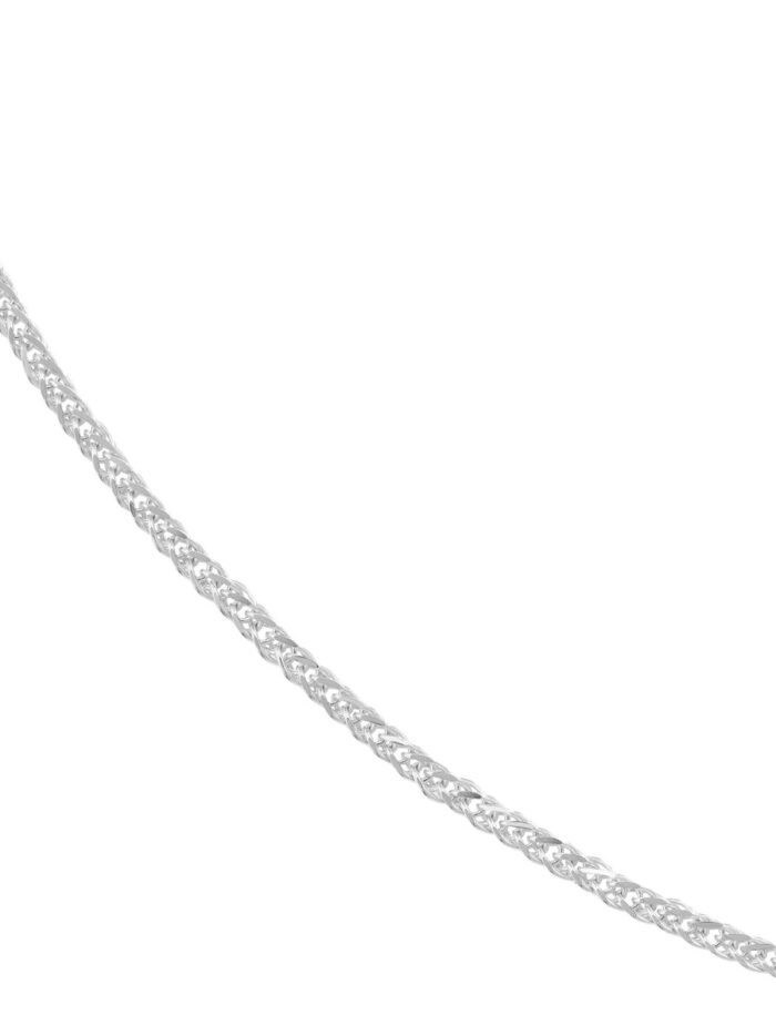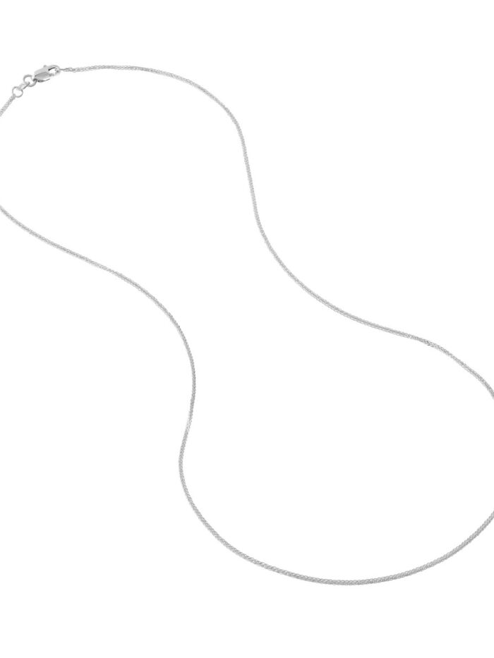 Elevate your style with this timeless 14K white gold Square Wheat Chain. Measuring 0.85mm in thickness, it offers a subtle yet elegant touch. The secure lobster clasp ensures comfortable wear all day long. This chain is perfect for layering or wearing solo, adding a touch of sophistication to any look.