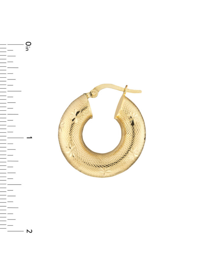 Elevate your style with these 10mm round textured D/C hoop earrings crafted from gleaming 14K yellow gold. The unique textured design adds a touch of modern sophistication, while the classic hoop shape remains timeless and versatile. Their secure hinge closure ensures a comfortable and confident fit.