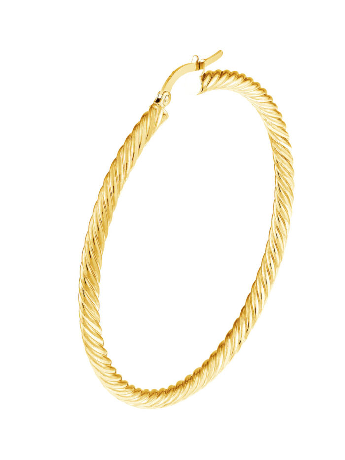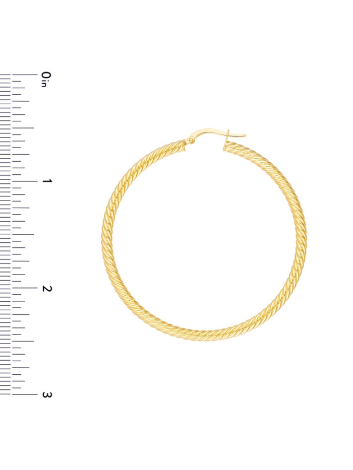 Add a touch of classic elegance to your look with these 14K yellow gold rope twist hoop earrings. The 50mm diameter creates a statement-making presence, while the twisted rope design adds a touch of modern flair. Crafted from lightweight gold, these earrings are comfortable to wear all day long.