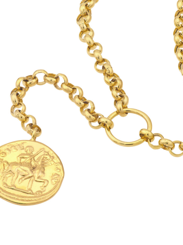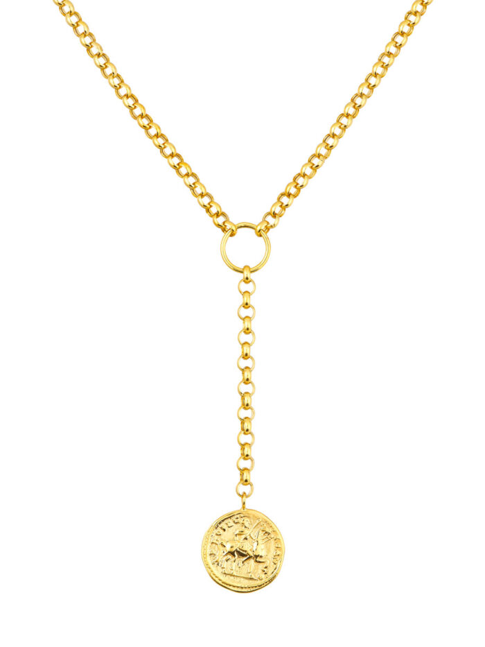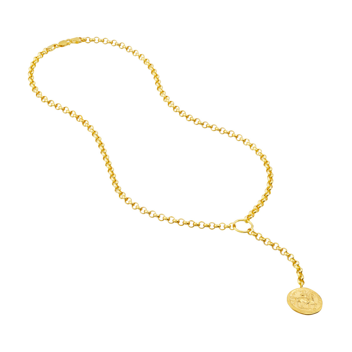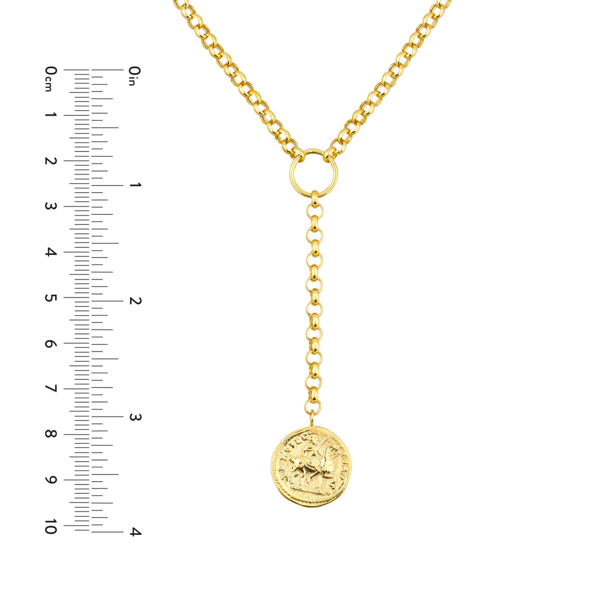 Embrace timeless elegance with this exquisite vintage-inspired necklace. A captivating ancient coin dangles gracefully from a sleek Rolo chain, creating a piece that effortlessly blends history and modern style. Crafted in lustrous 14K yellow gold, this necklace adds a touch of sophistication to any outfit.