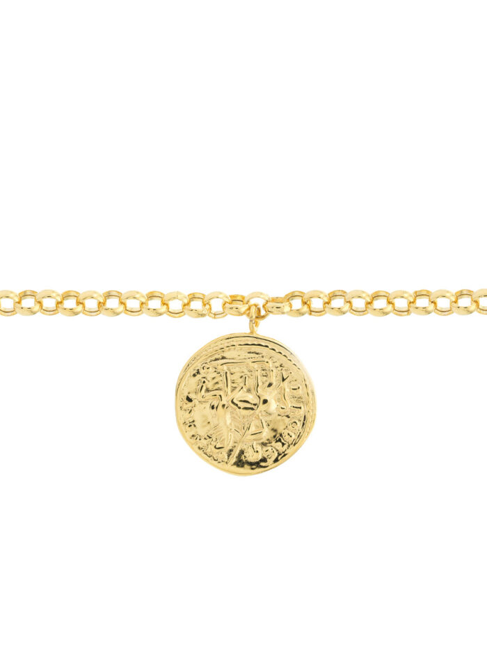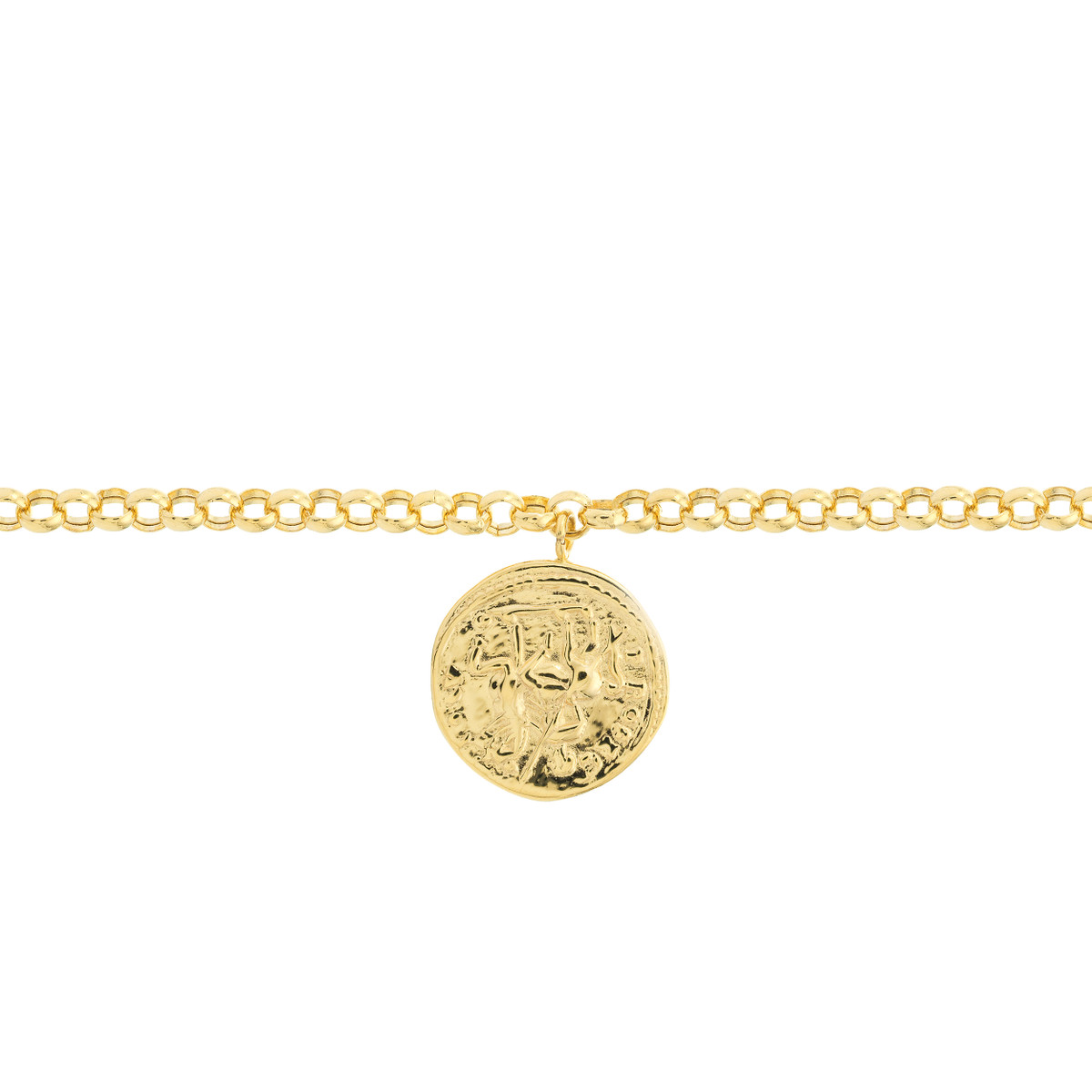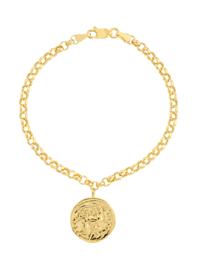 A timeless classic, this 14K yellow gold bracelet combines the charm of an antique coin with the sleekness of a Rolo chain. The adjustable clasp allows for a perfect fit, while the intricate coin design adds a touch of history and sophistication. Whether dressing up or down, this bracelet is a versatile accessory that complements any style.