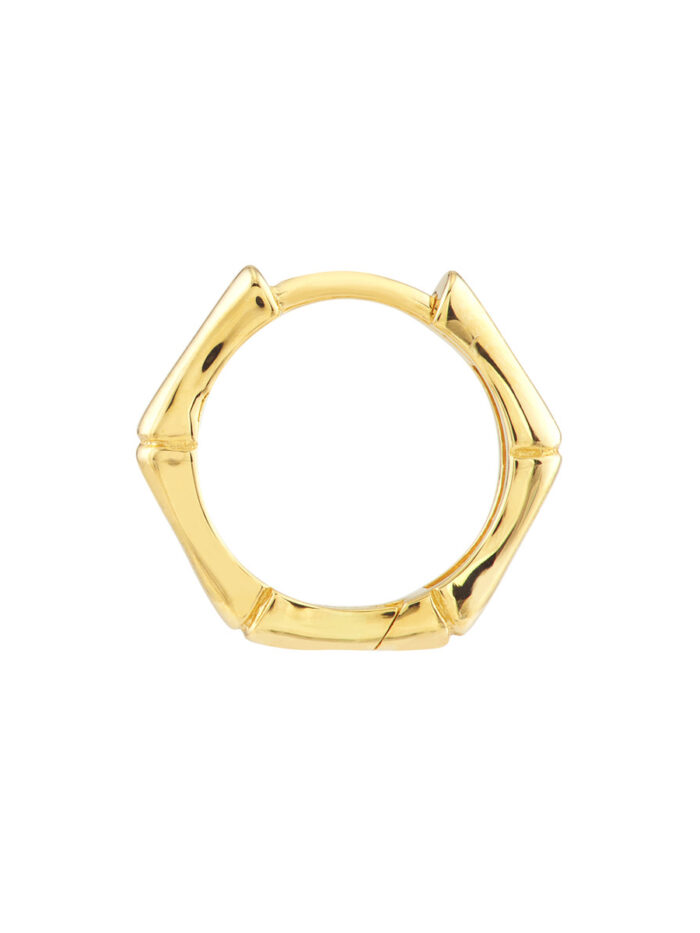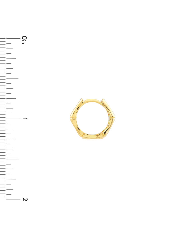 Make a statement with these eye-catching 12.50mm Bamboo Pentagon Hoops. Crafted from gleaming 14K yellow gold, these earrings feature a unique geometric pentagon design that adds a touch of modern flair. The hinge closure provides a secure and comfortable fit, perfect for everyday wear or special occasions.