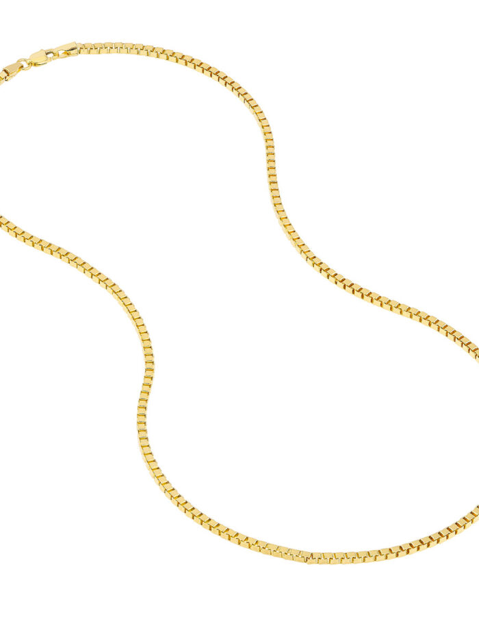 Elevate your everyday look with this stunning 14K yellow gold box chain. Crafted with meticulous attention to detail, the 2.0mm thickness adds a touch of elegance and sophistication. The secure lobster closure ensures a comfortable and confident fit. This versatile necklace is perfect for layering or wearing solo, making a timeless addition to your jewelry collection.