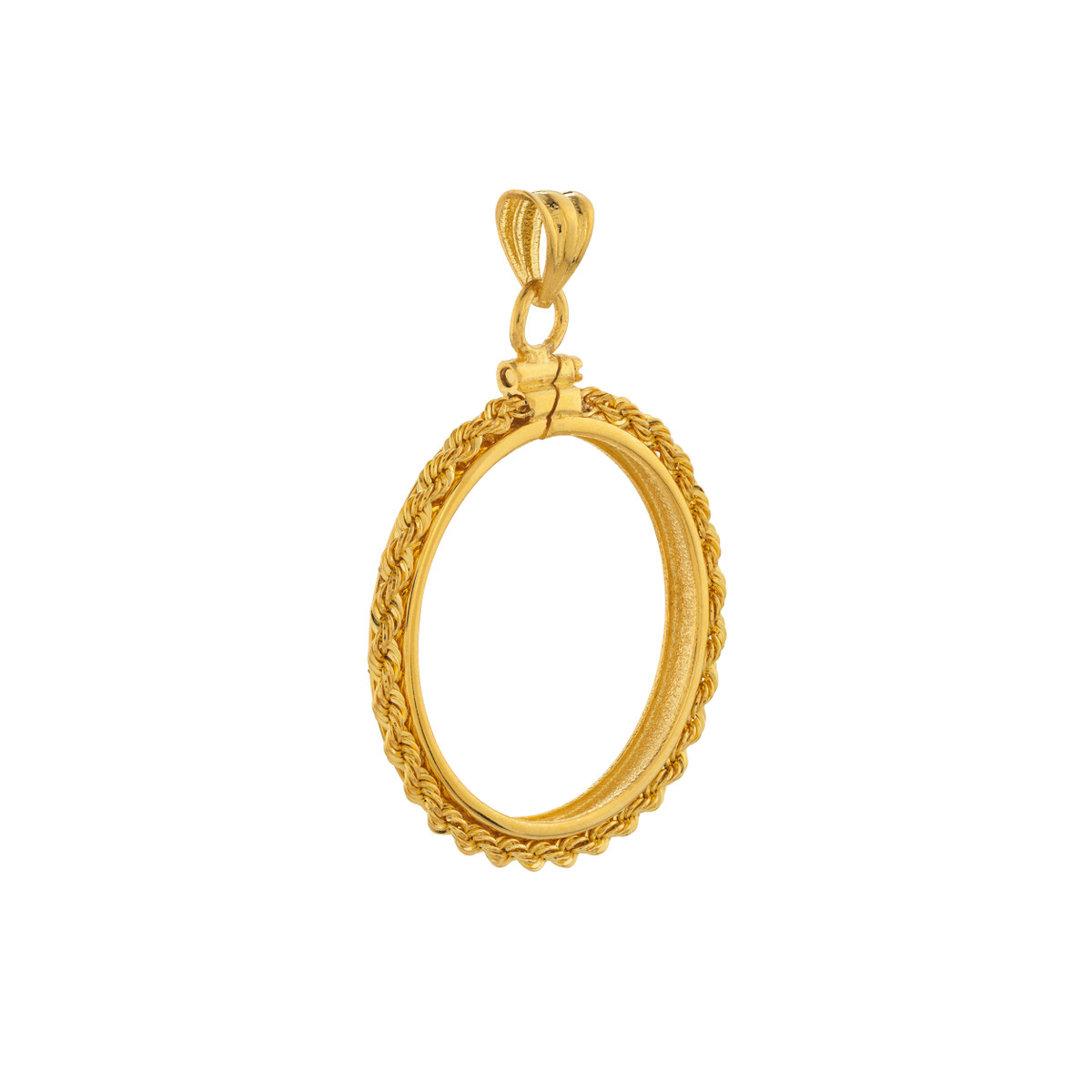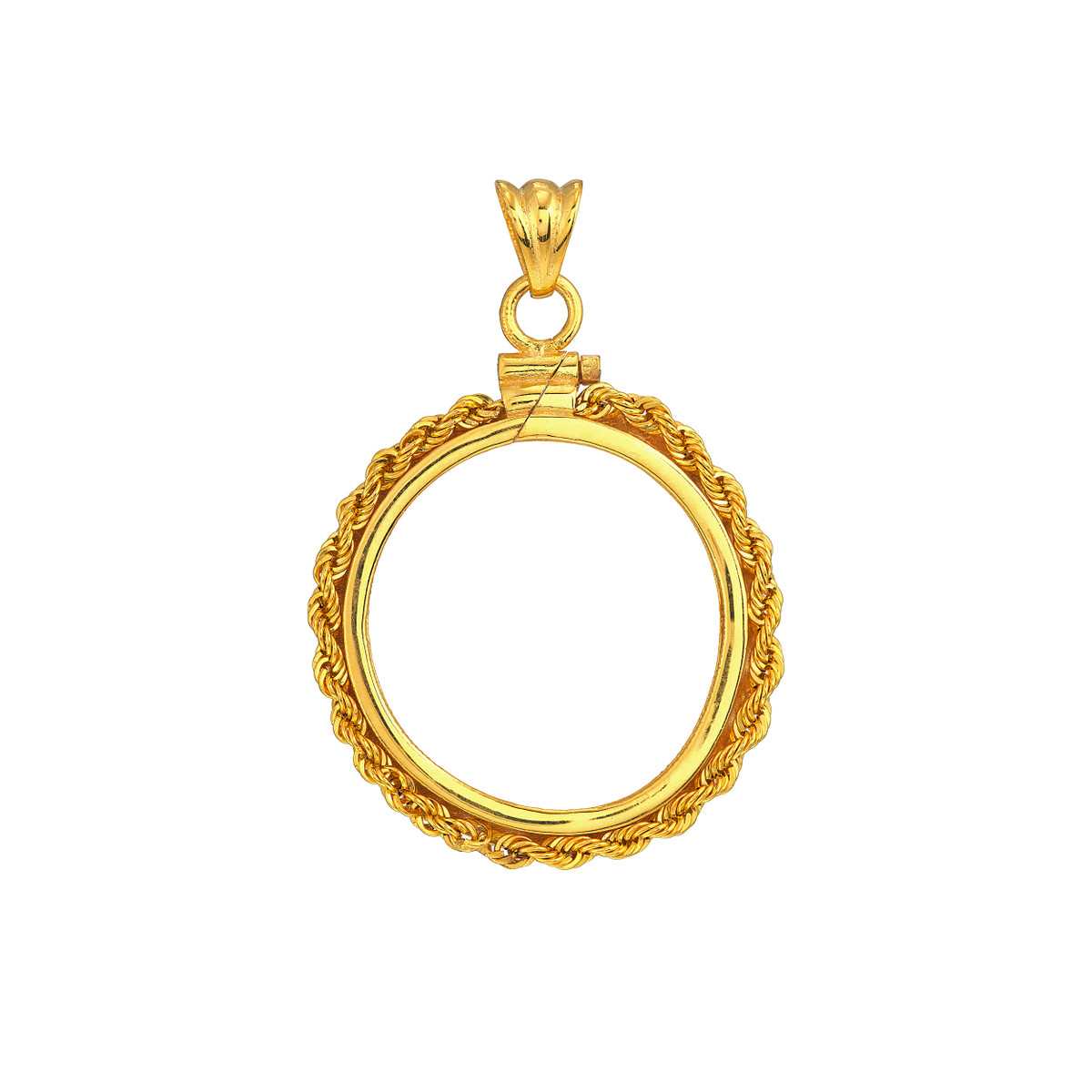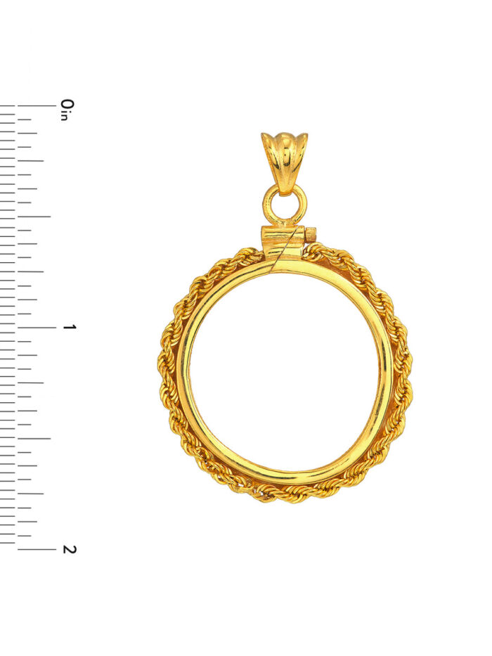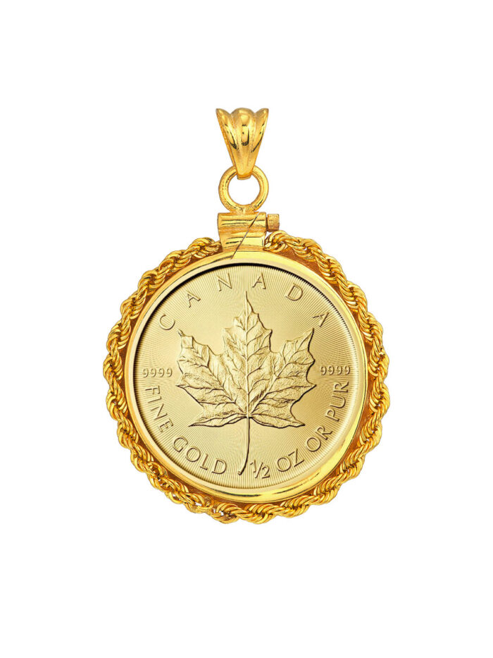 Celebrate your love for Canadian Maple Leafs with this beautiful 14K yellow gold coin bezel. The secure rope chain closure keeps your 1/2 oz coin safely displayed, while the elegant design adds a touch of sophistication to any outfit.