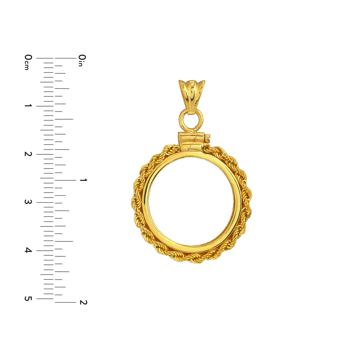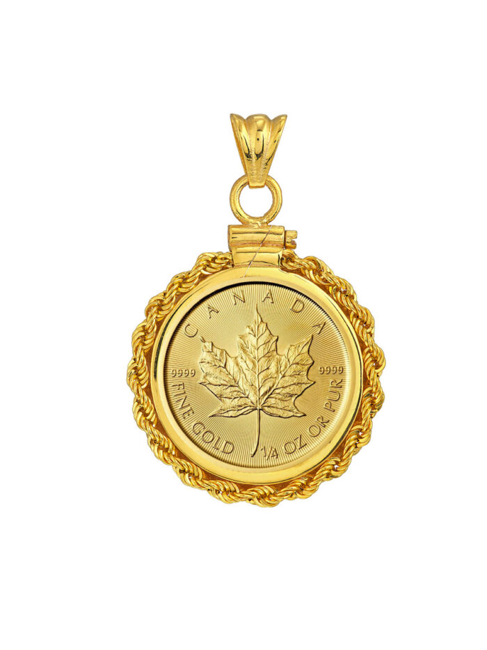 Display your Canadian Maple Leaf coin with pride in this stunning 14K yellow gold bezel. Crafted with a secure rope chain closure, this bezel is the perfect way to protect and showcase your valuable coin. The compact design makes it a versatile addition to any jewelry collection.