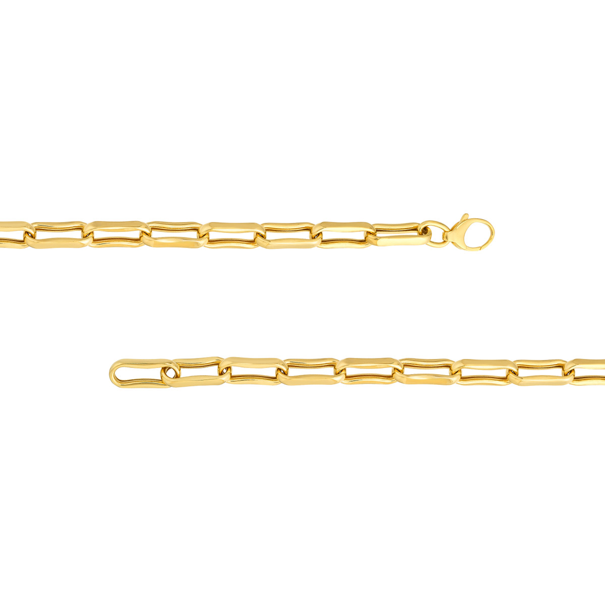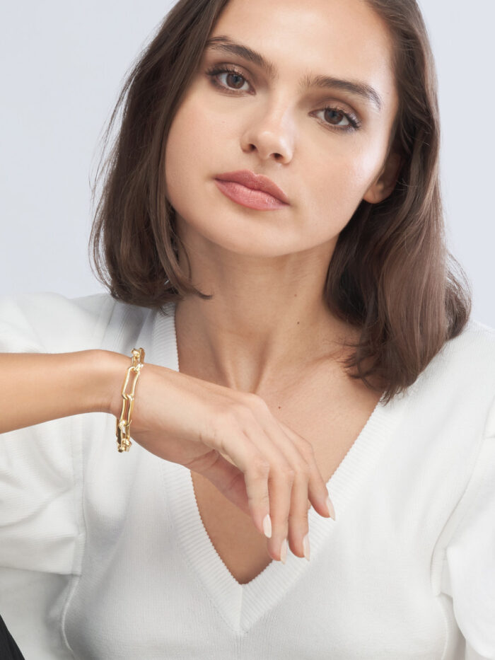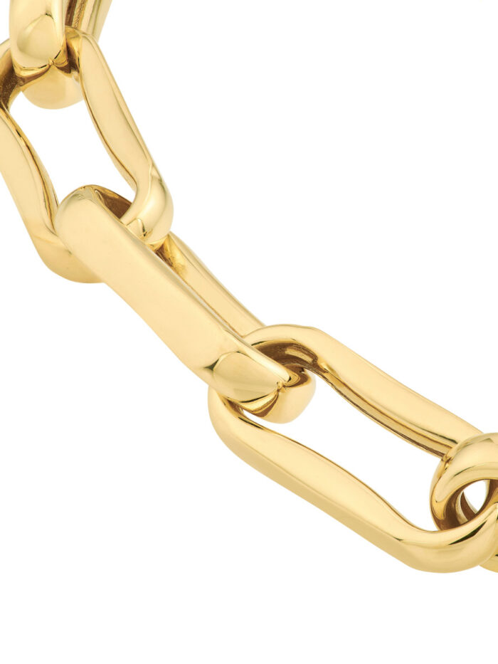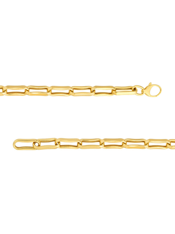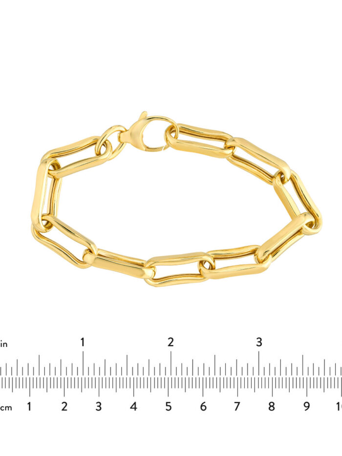 Make a statement with this chunky oval pinched link bracelet crafted from 14K yellow gold. The bold design features eye-catching links, adding a touch of sophistication to any outfit. Crafted from solid gold and secured with a lobster clasp, this 7.75-inch bracelet is a luxurious and durable accessory.