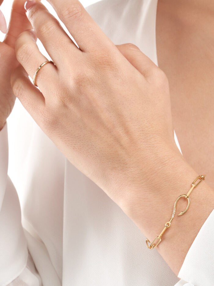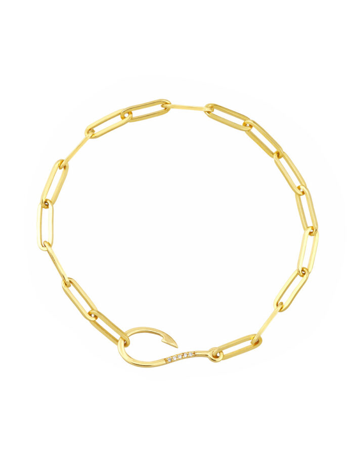 Indulge in the exquisite sparkle of the 14K Yellow Gold Diamond Accent Paper Clip Bracelet. This stunning piece features a delicate paper clip chain adorned with three sparkling diamonds, adding a touch of brilliance to any ensemble. The 7.5-inch length drapes elegantly on the wrist, making it a captivating statement piece. Crafted from luxurious 14K gold, this bracelet is a timeless treasure.