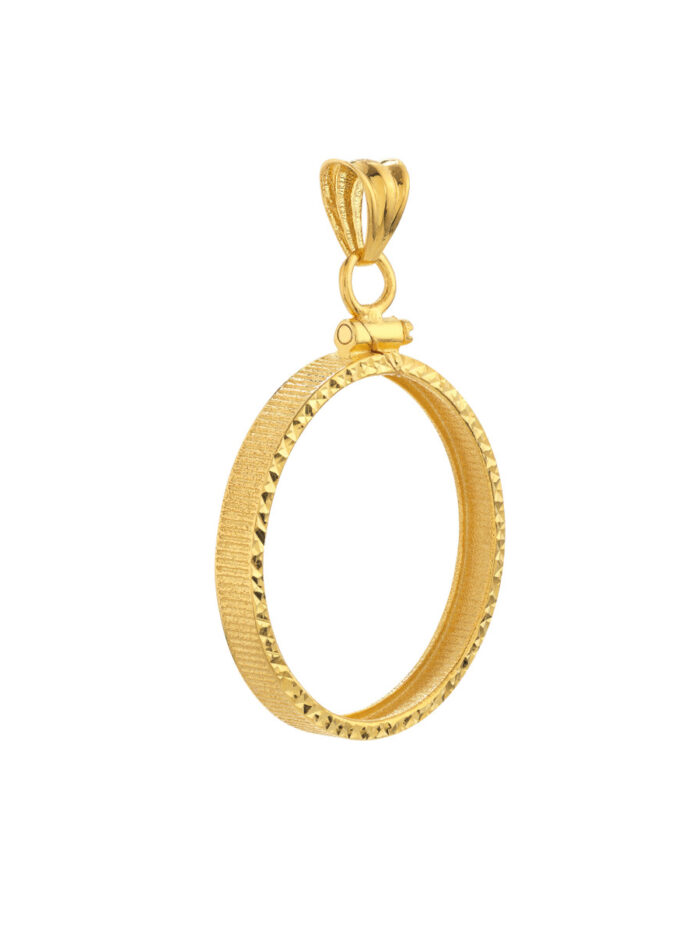 This stunning 14K yellow gold diamond cut bezel pendant is the perfect way to showcase your 1/2 oz American Eagle coin. Crafted with meticulous attention to detail, the diamond cut design adds a luxurious sparkle, while the secure screw top keeps your coin safe and secure.