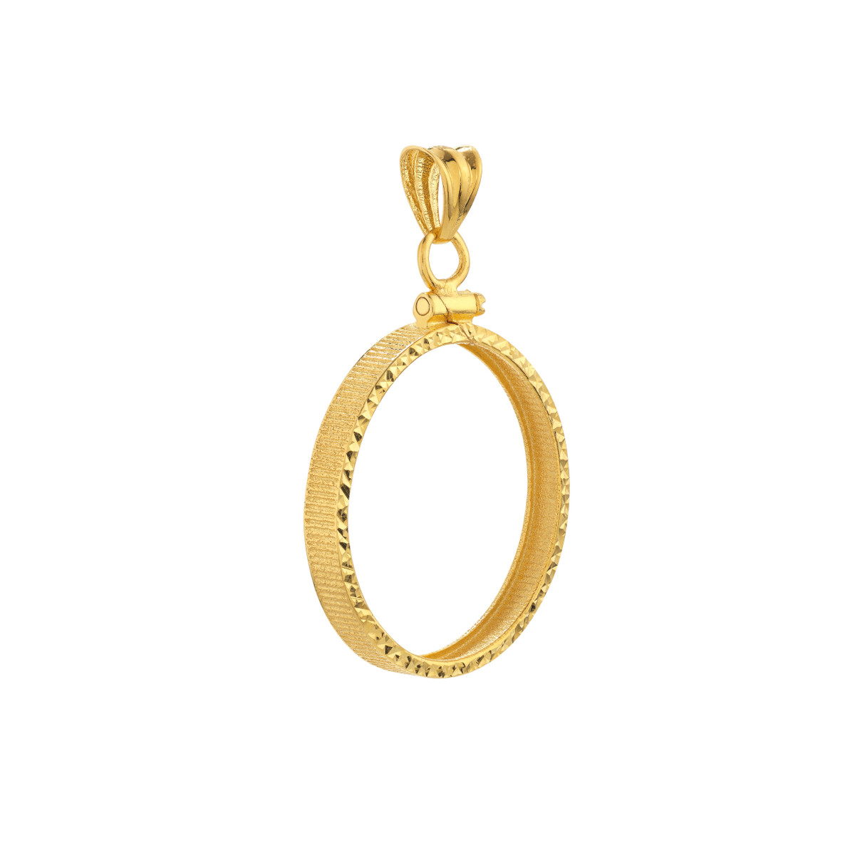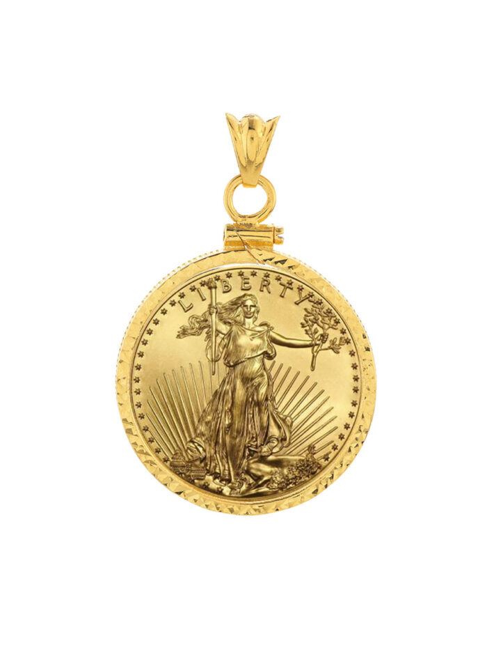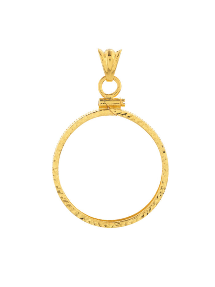 This stunning 14K yellow gold diamond cut bezel pendant is the perfect way to showcase your 1/2 oz American Eagle coin. Crafted with meticulous attention to detail, the diamond cut design adds a luxurious sparkle, while the secure screw top keeps your coin safe and secure.