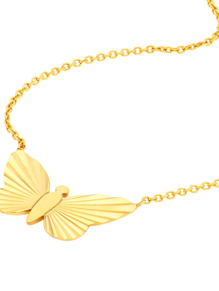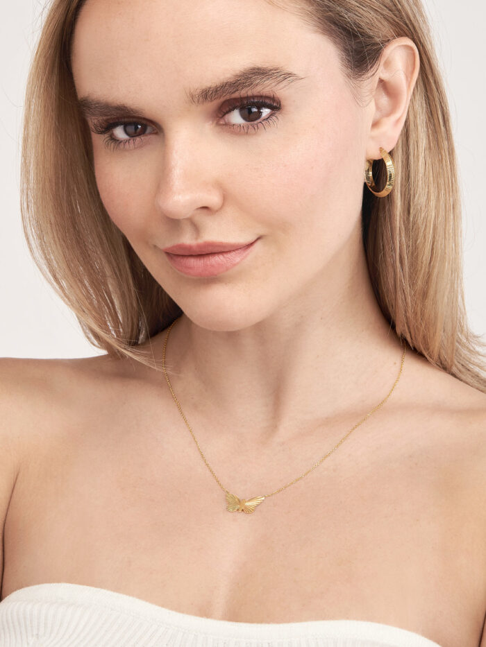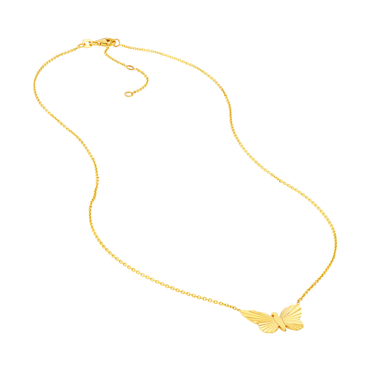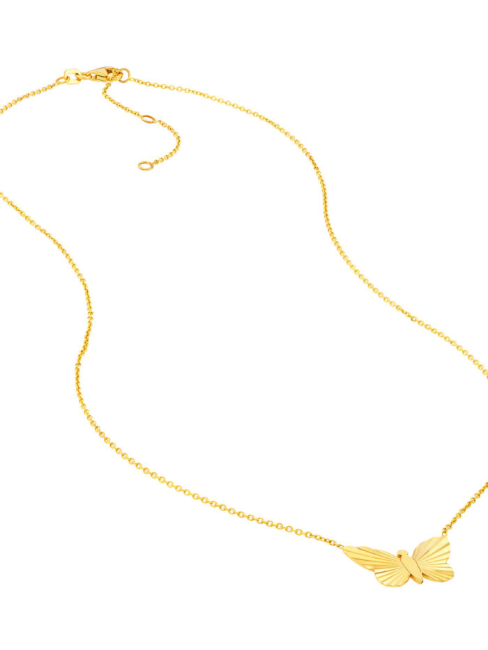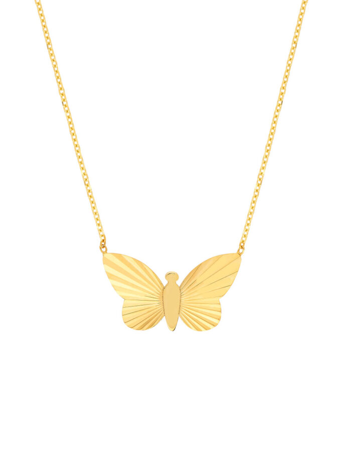 Celebrate the beauty and wonder of life with our enchanting fluted butterfly necklace. Crafted from lustrous 14K yellow gold, this delicate pendant features a meticulously detailed butterfly design, symbolizing transformation and hope. Suspended from an adjustable cable chain, it gracefully drapes around the neck.