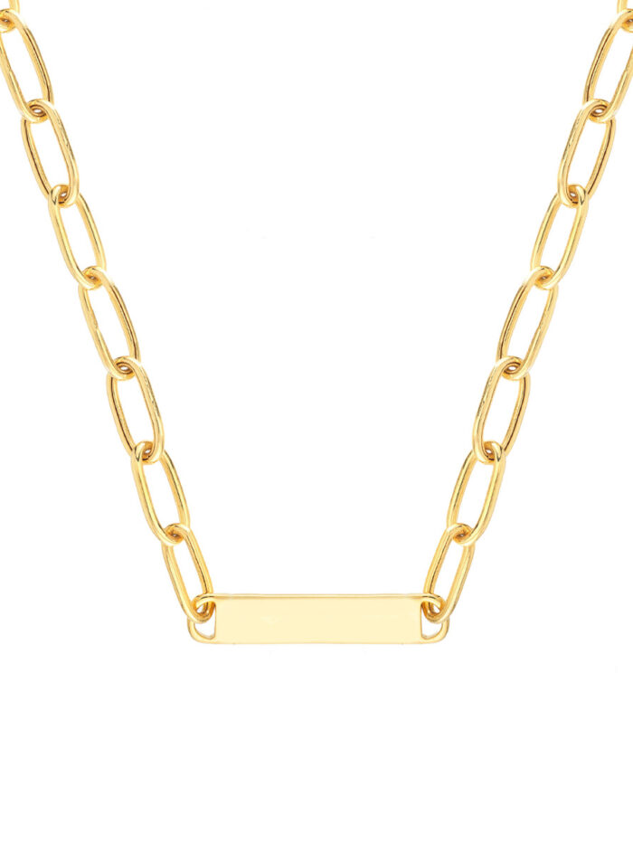 Elevate your style with this elegant 16-inch Forzentina chain necklace featuring a 30mm engraved ID bar. Crafted from gleaming 14K yellow gold, this necklace exudes sophistication and charm. The engravable ID bar offers a unique opportunity to personalize your piece with a meaningful message, initials, or a special date, making it a truly one-of-a-kind treasure.