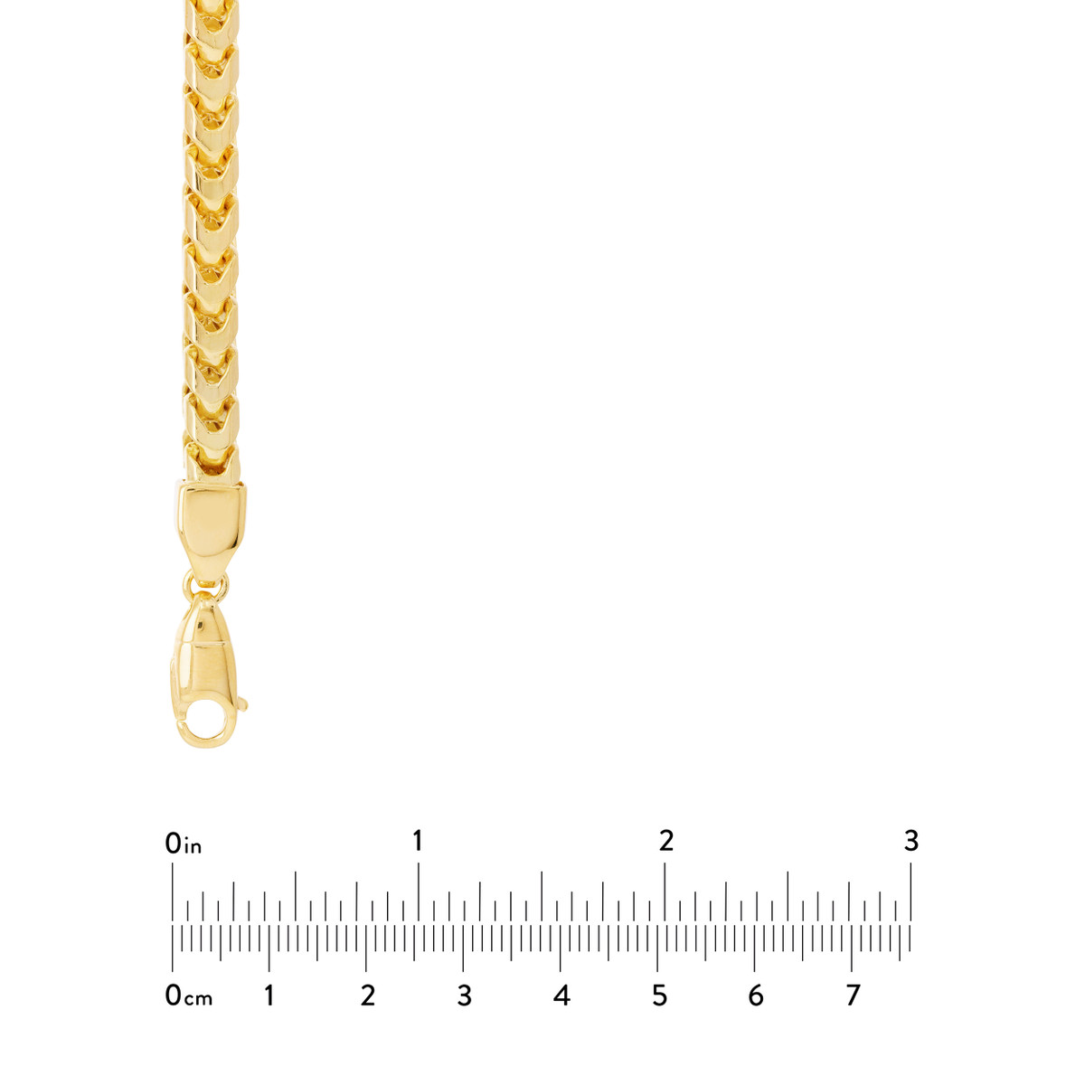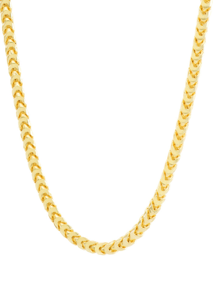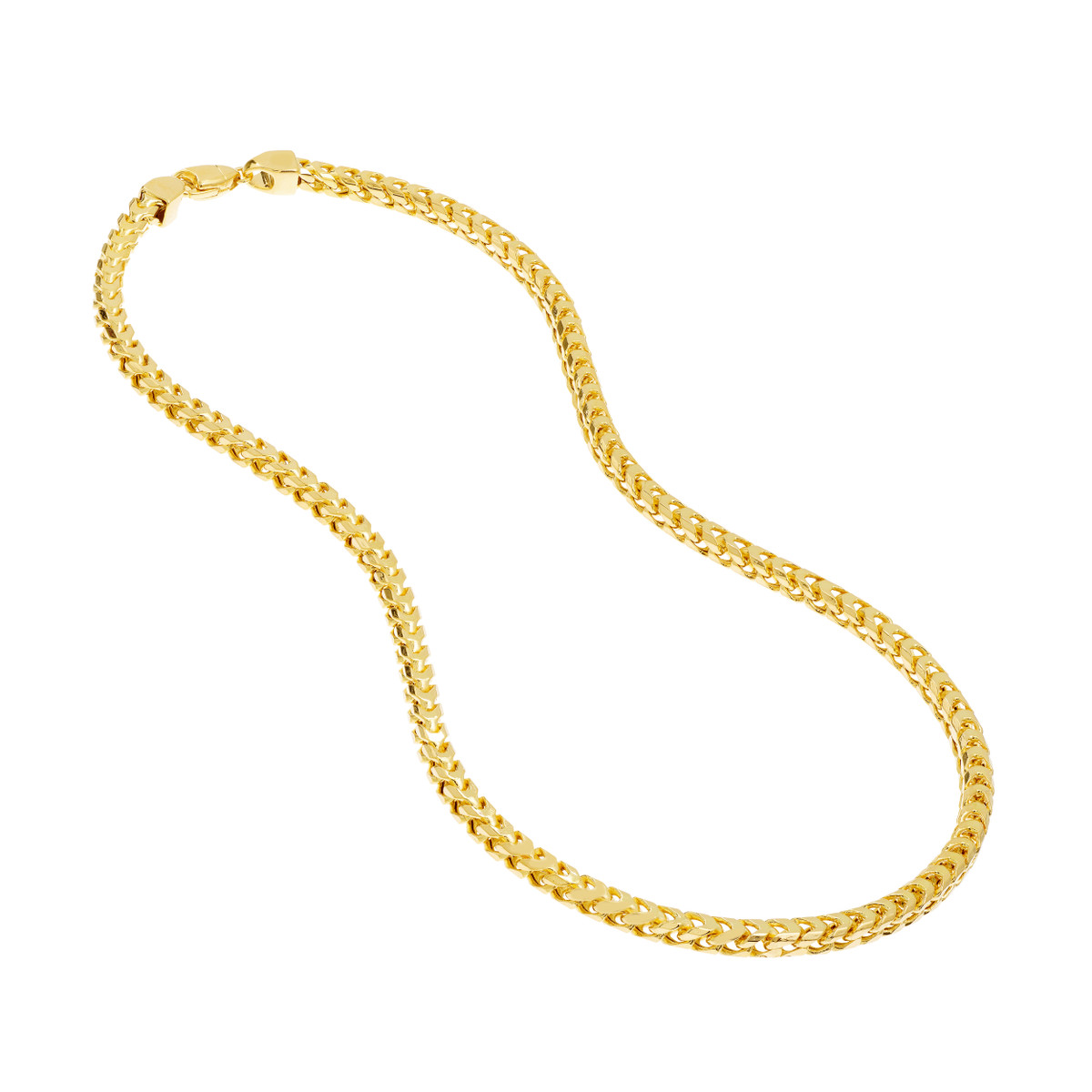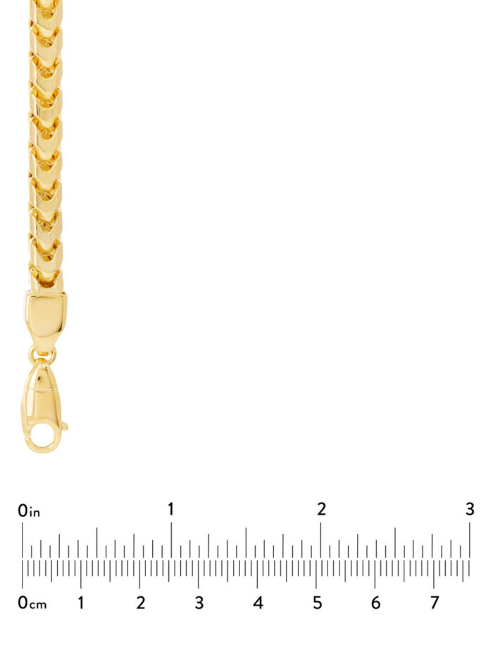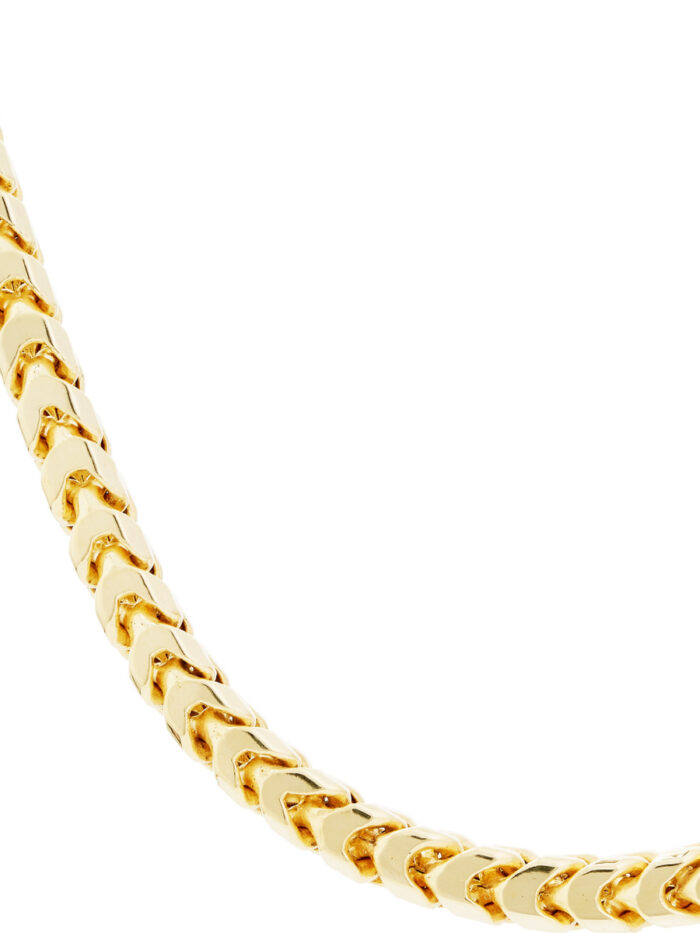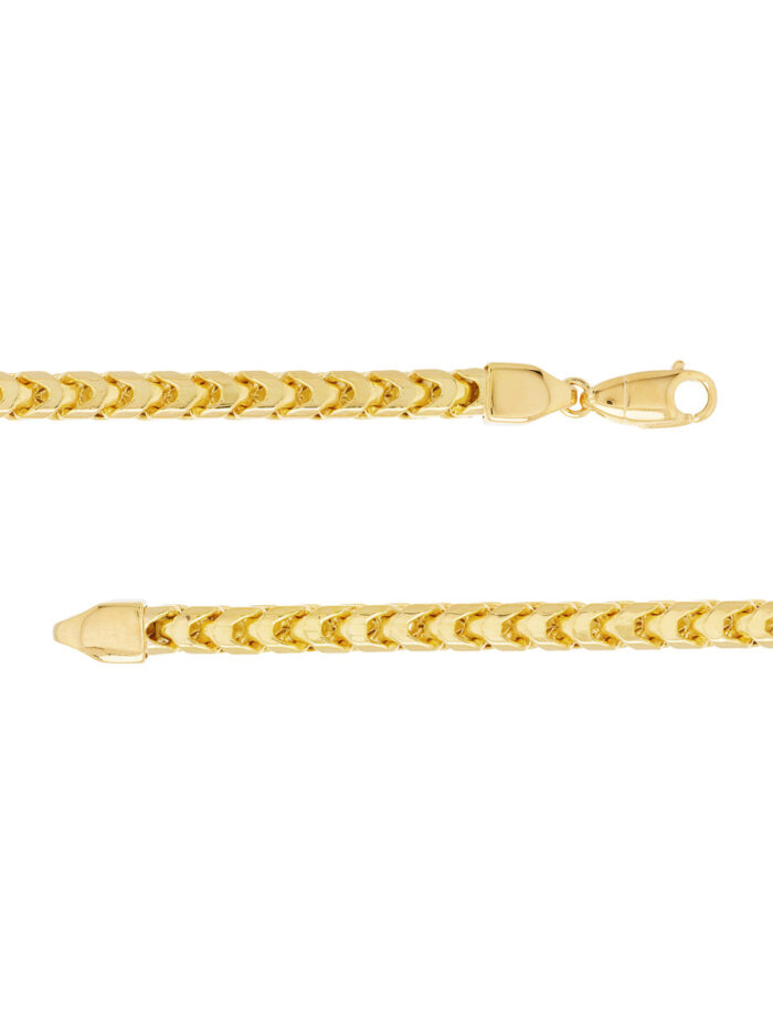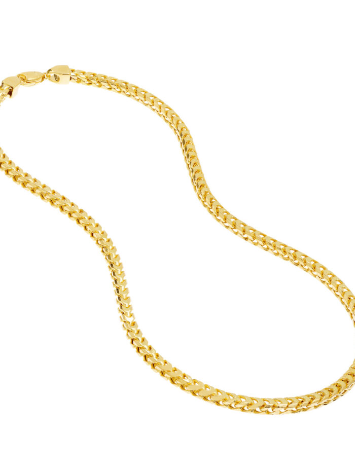 Make a sleek statement with this 14K yellow gold hollow Franco Chain. The classic Franco design features interlocking oval links, creating a strong and sophisticated look. This chain is perfect for layering or wearing solo. The secure lobster closure ensures a comfortable and confident fit.