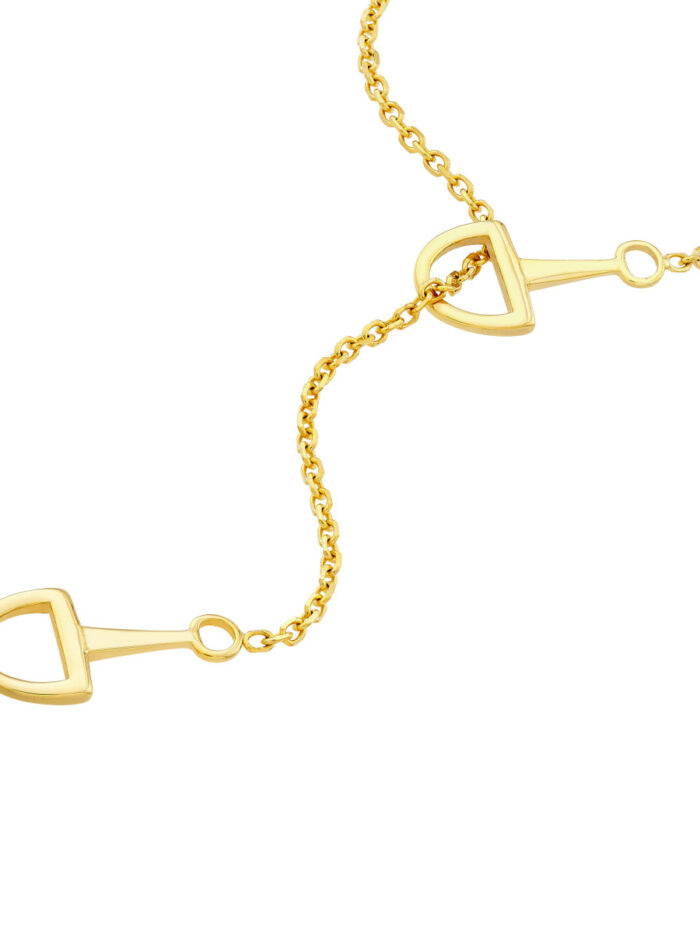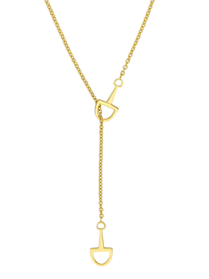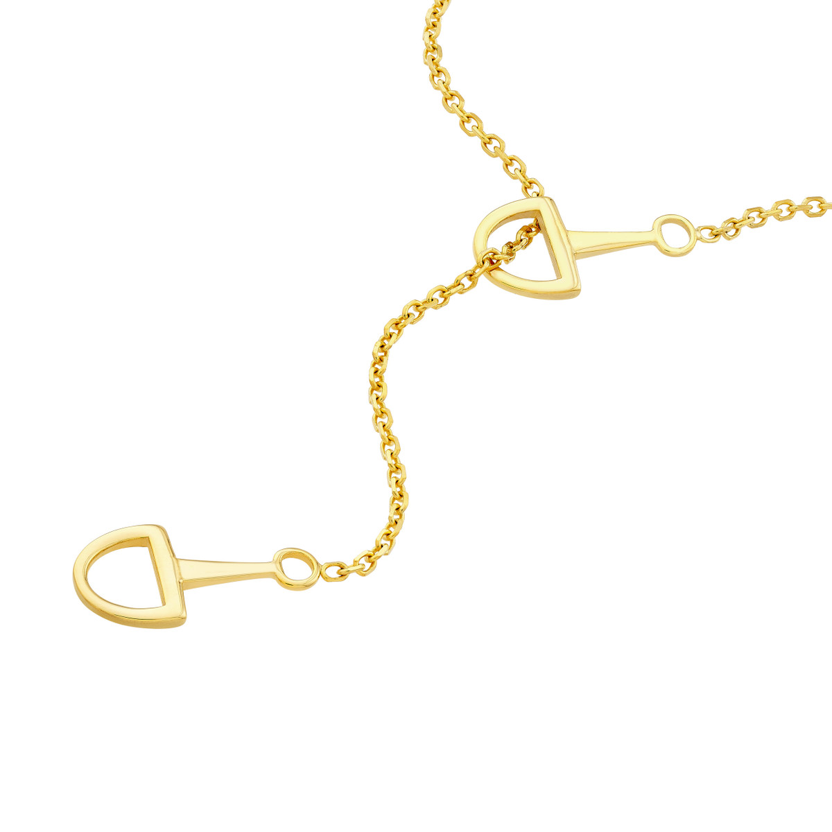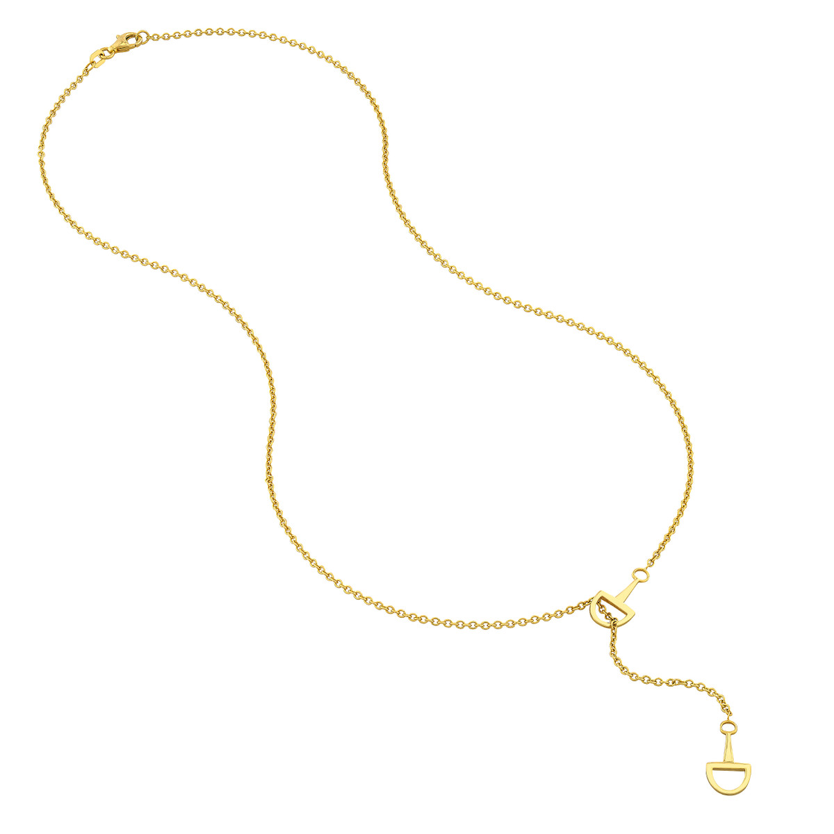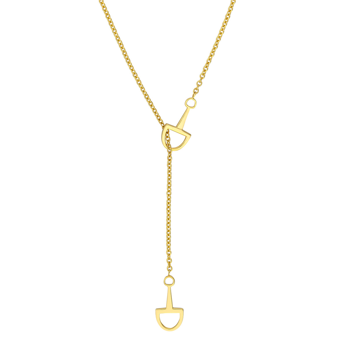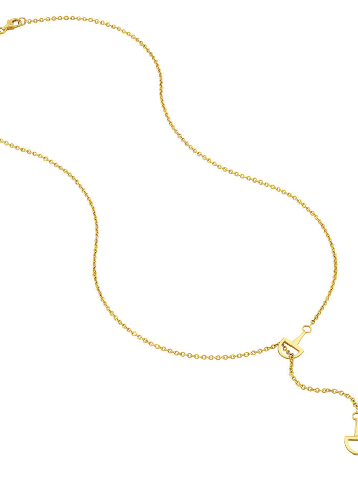 Make a statement with this eye-catching Horse Bit Lariat Necklace crafted from 14K yellow gold. Featuring two exquisite horse bit charms on a sturdy cable chain, this necklace exudes both elegance and strength. The 18-inch length drapes beautifully, and the secure pear-shaped lobster clasp ensures a comfortable and confident wear.