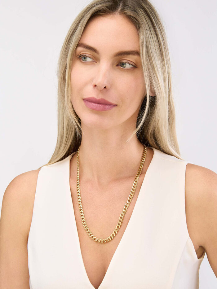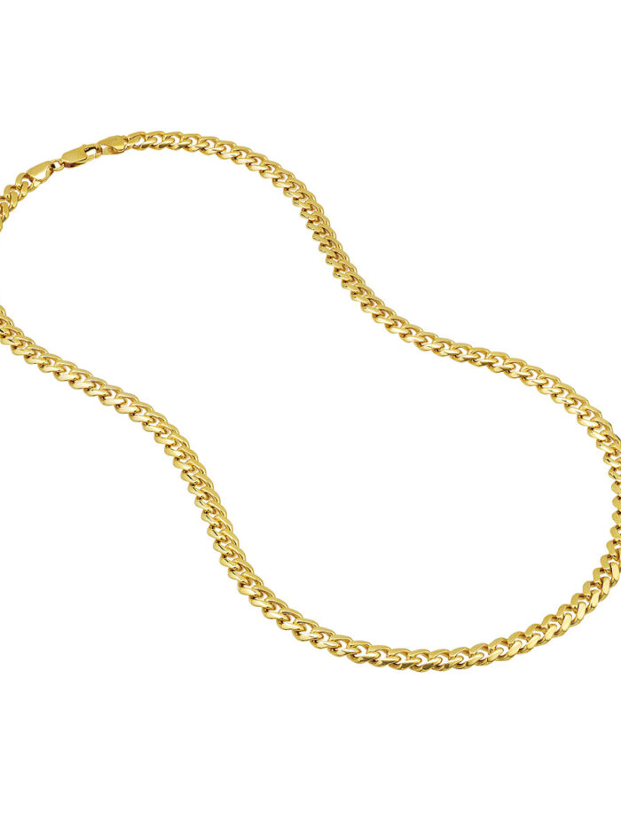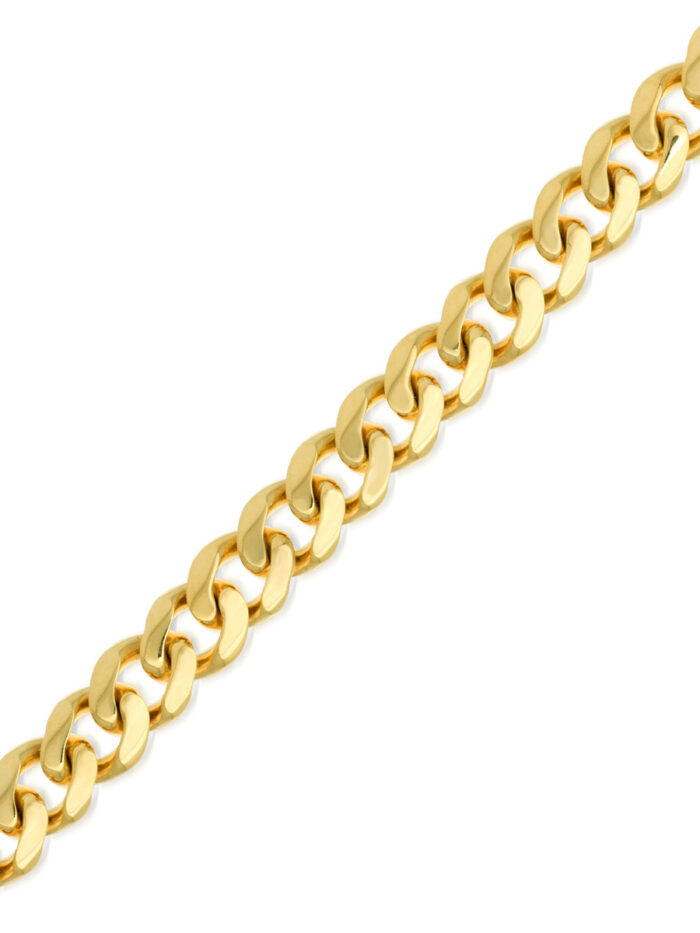 This stunning 7.3mm wide Miami Cuban chain is crafted from 14K yellow gold, making it a luxurious and eye-catching accessory. The popular Miami Cuban chain style is renowned for its distinctive, interwoven links, creating a bold and trendy look. Securely fastened with a lobster lock closure, this 8.5-inch chain is the perfect way to elevate any outfit.