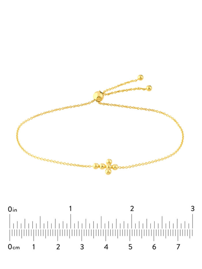 Embrace timeless style with this charming 14K yellow gold bolo bracelet. Featuring a dainty beaded cross design, this bracelet adds a touch of sophistication to any outfit. The adjustable closure allows for a customized fit, ensuring comfort and versatility.