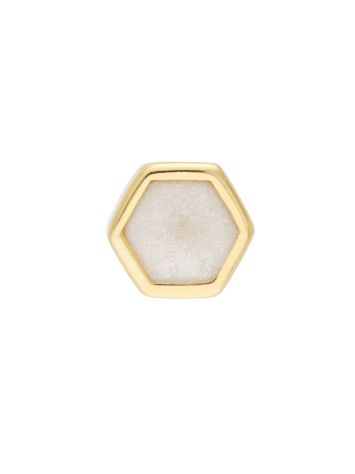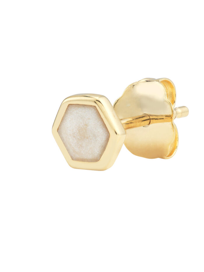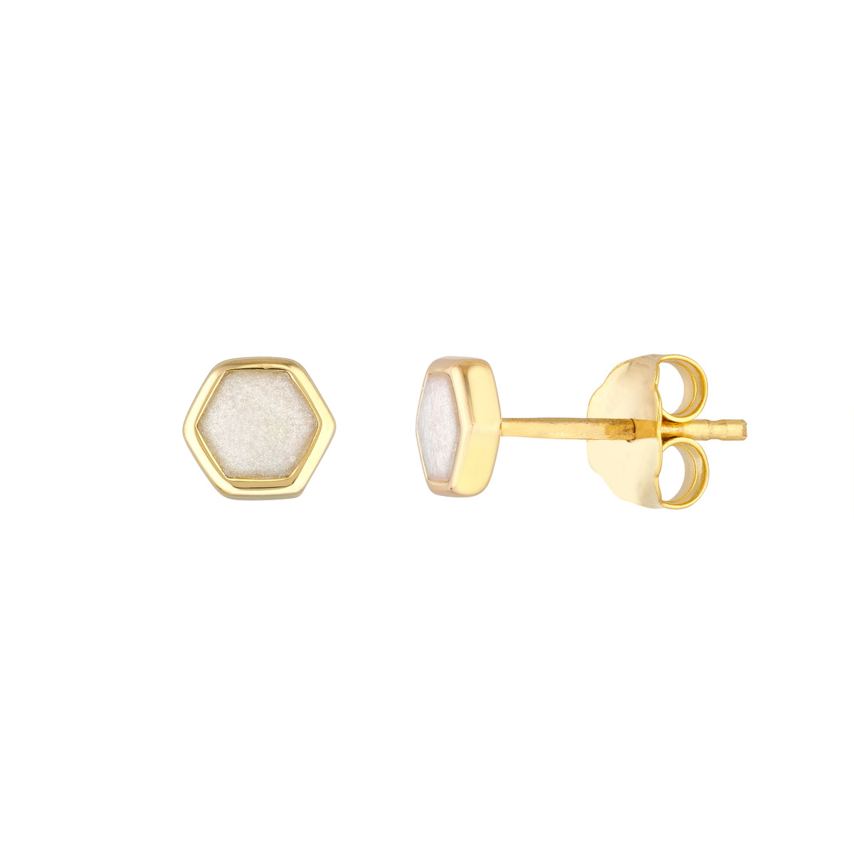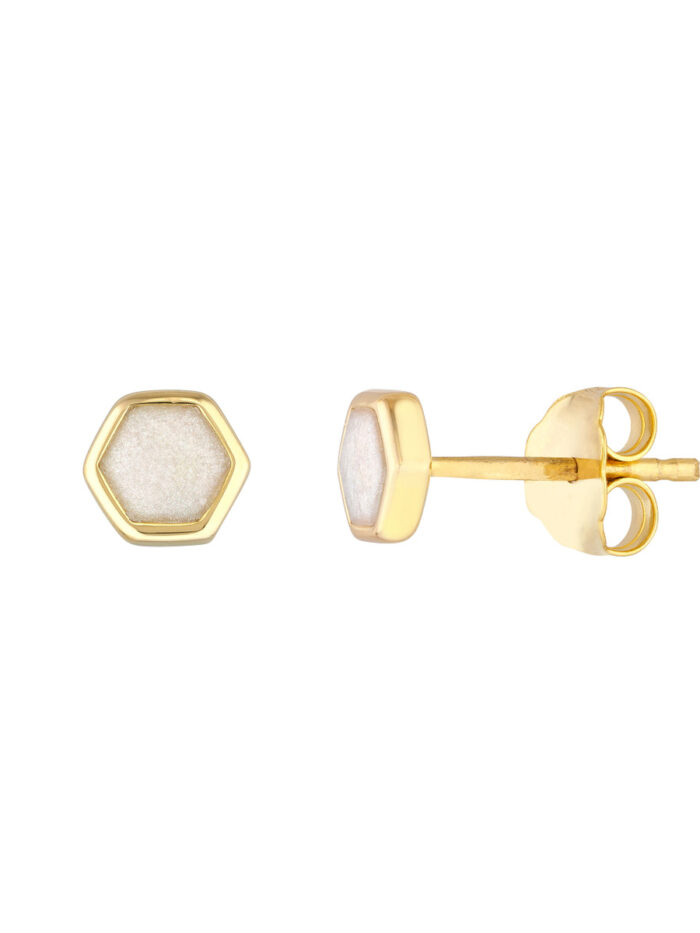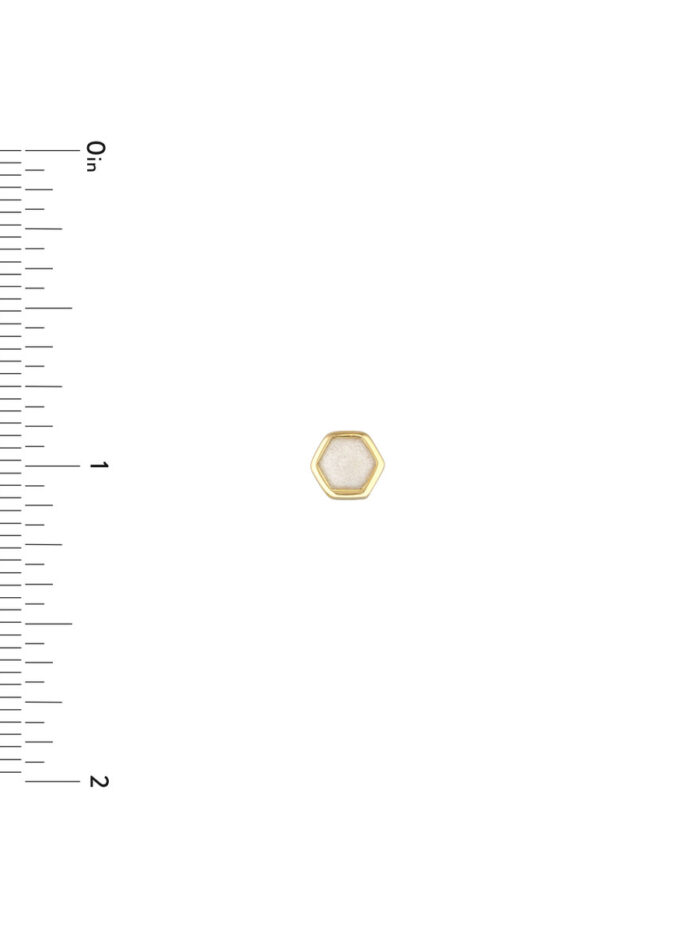 Make a statement with these stunning 14K yellow gold hexagon stud earrings. The mother of pearl enamel adds a touch of iridescent beauty, while the geometric hexagon shape creates a modern and eye-catching design. Perfect for adding a touch of unique style to any outfit.