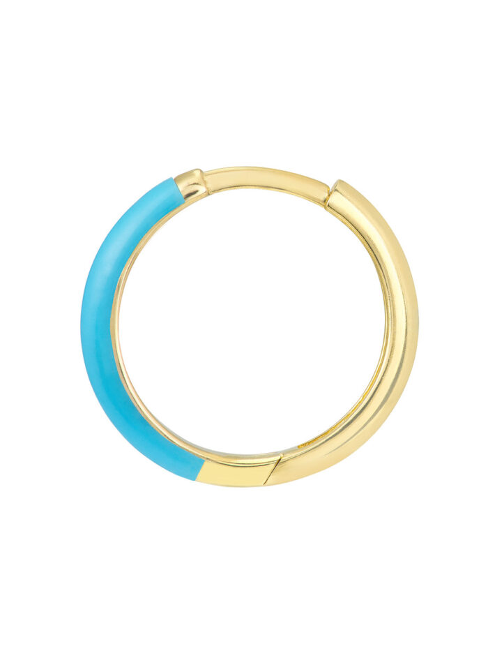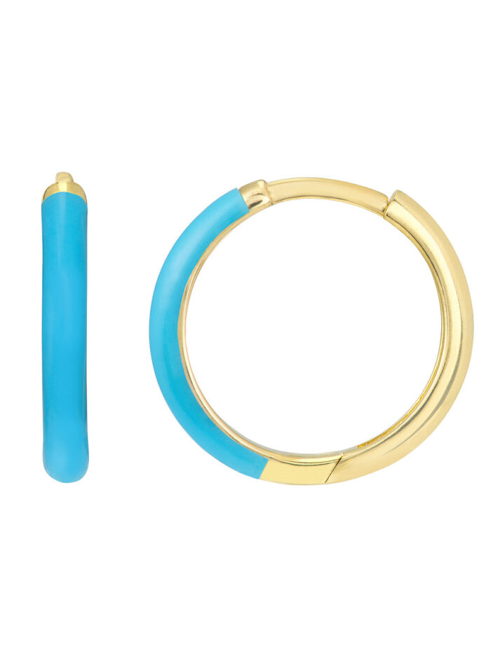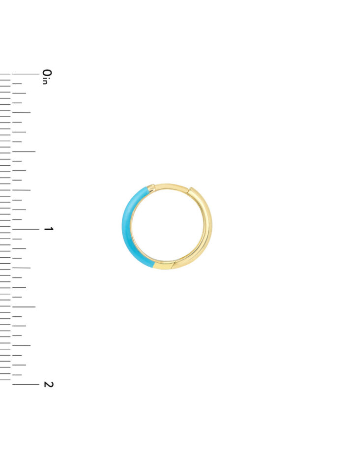Add a vibrant touch to your look with these eye-catching 1/2 inch neon blue enamel hoops crafted from 14K yellow gold. The polished finish adds a touch of sophistication, while the bright neon blue enamel makes a bold statement. These versatile hoops can be worn alone for a pop of color or paired with other earrings for a more eclectic ensemble. The secure hinge closure ensures they stay comfortably in place all day long.