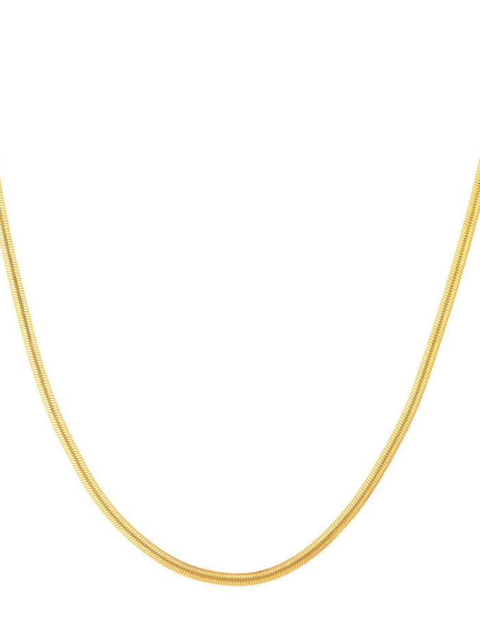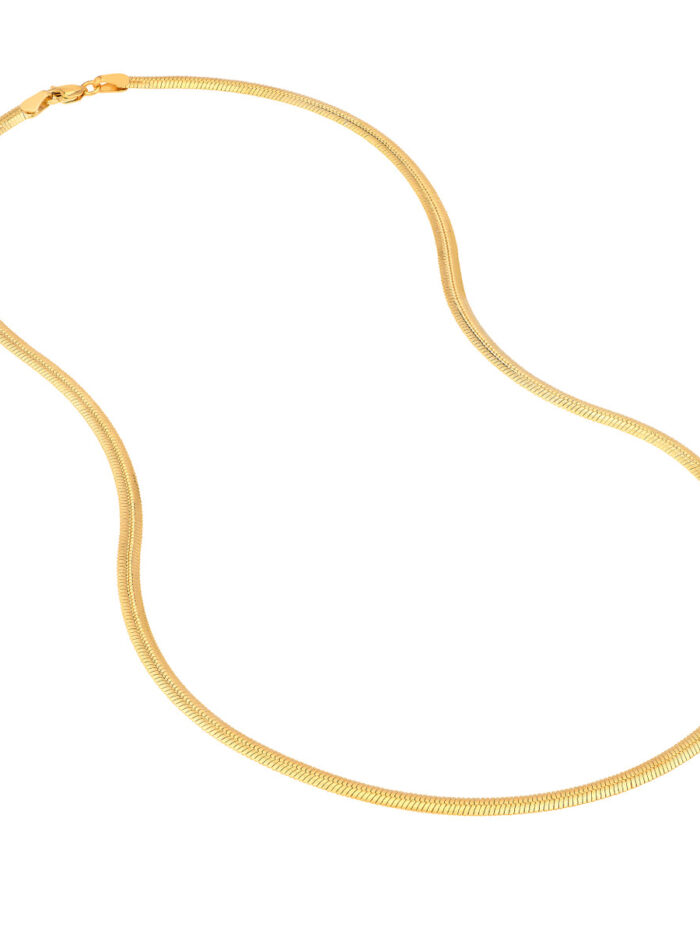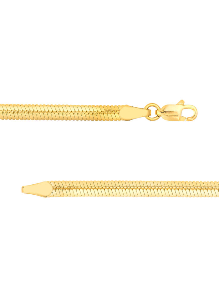 Experience the sleek sophistication of this 14K yellow gold oval snake chain. Its delicate 3.20mm thickness drapes beautifully, while the polished surface reflects light for a truly captivating look. The secure lobster lock closure ensures it stays in place all day long. Perfect for minimalist styling or adding a touch of elegance to your layered look, this chain is a timeless treasure for any occasion.