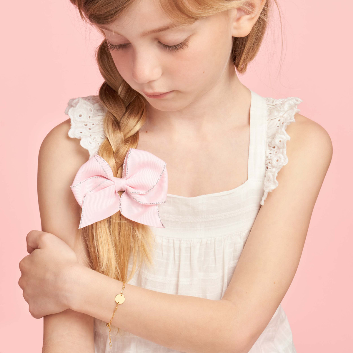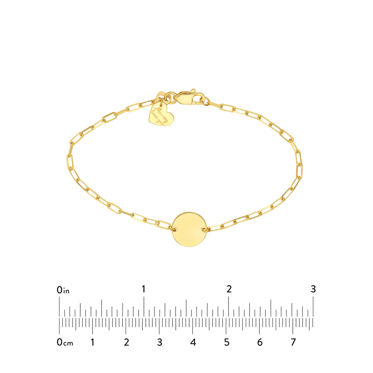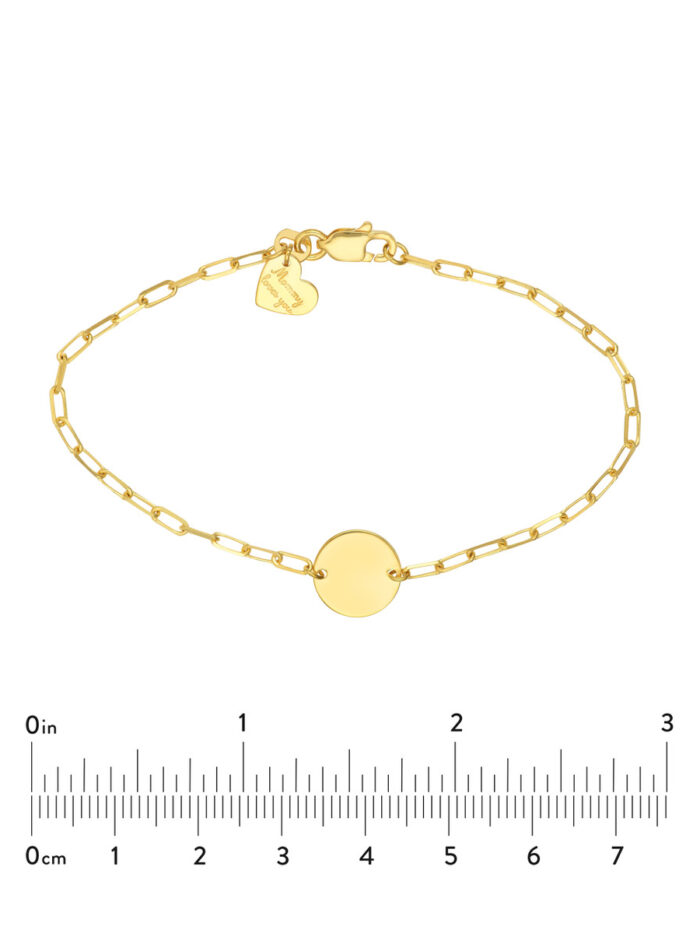 This charming paper clip chain bracelet is the perfect gift for a beloved child. Crafted from lustrous 14K yellow gold, it features a delicate yet durable paper clip chain design and a special engravable disc, allowing you to personalize it with a meaningful message or date. The secure lobster closure ensures a comfortable and snug fit. At 6 inches in length, it’s ideal for younger wrists.