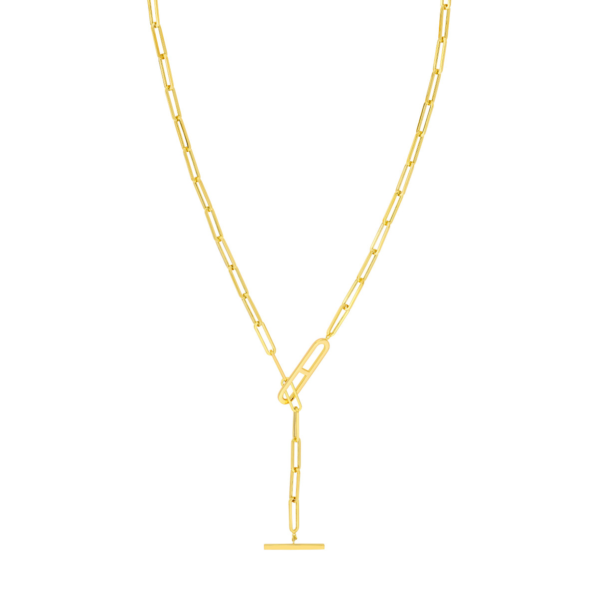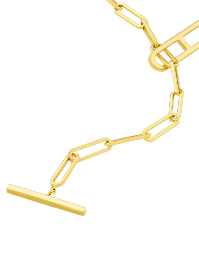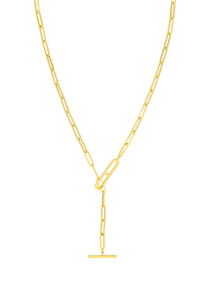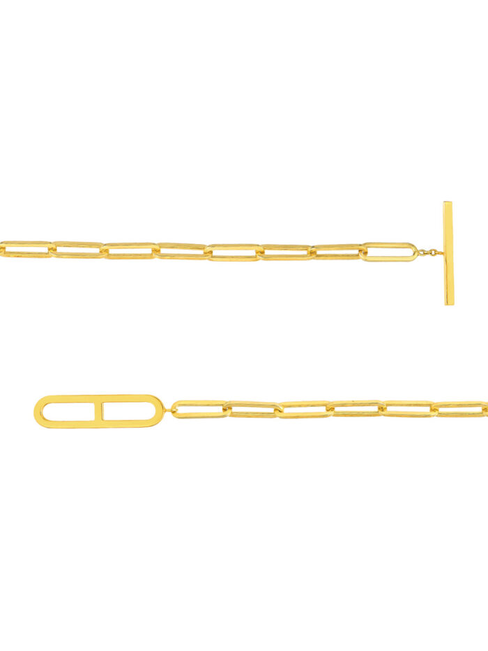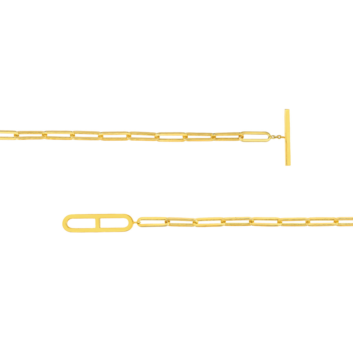 Elevate your style with this chic paper clip toggle necklace. Crafted from gleaming 14K yellow gold, the 3.8mm hollow paper clip chain exudes a modern and sophisticated vibe. The secure toggle closure ensures a comfortable and confident fit. Wear it as a statement piece or layer it with other necklaces for a personalized touch. The versatile design allows you to style it both as a classic necklace or a trendy lariat.