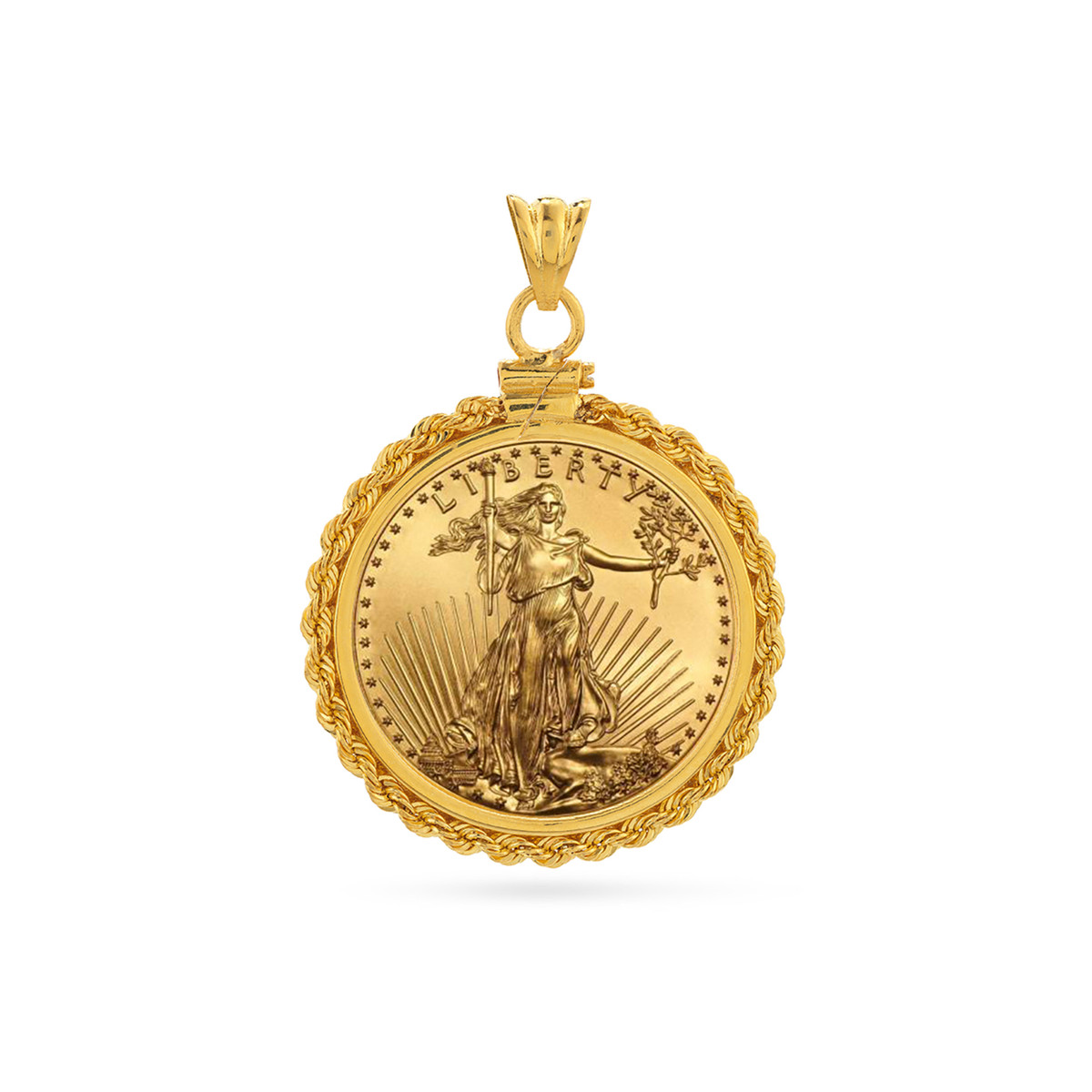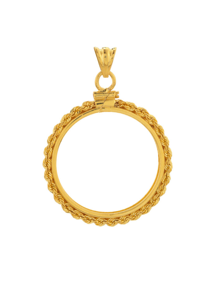 Make a bold statement with this eye-catching 14K yellow gold rope chain bezel, designed to perfectly showcase your 1/2 oz American Eagle coin. The secure screw top closure ensures your coin stays safe and in place. This pendant adds a touch of both classic and modern style to any look.