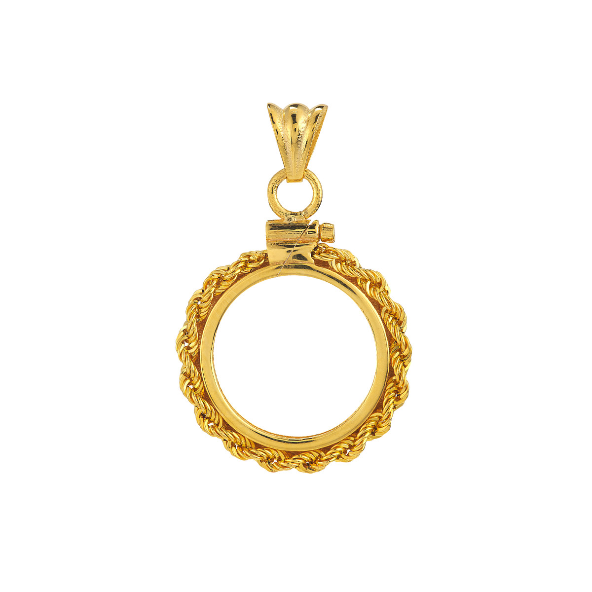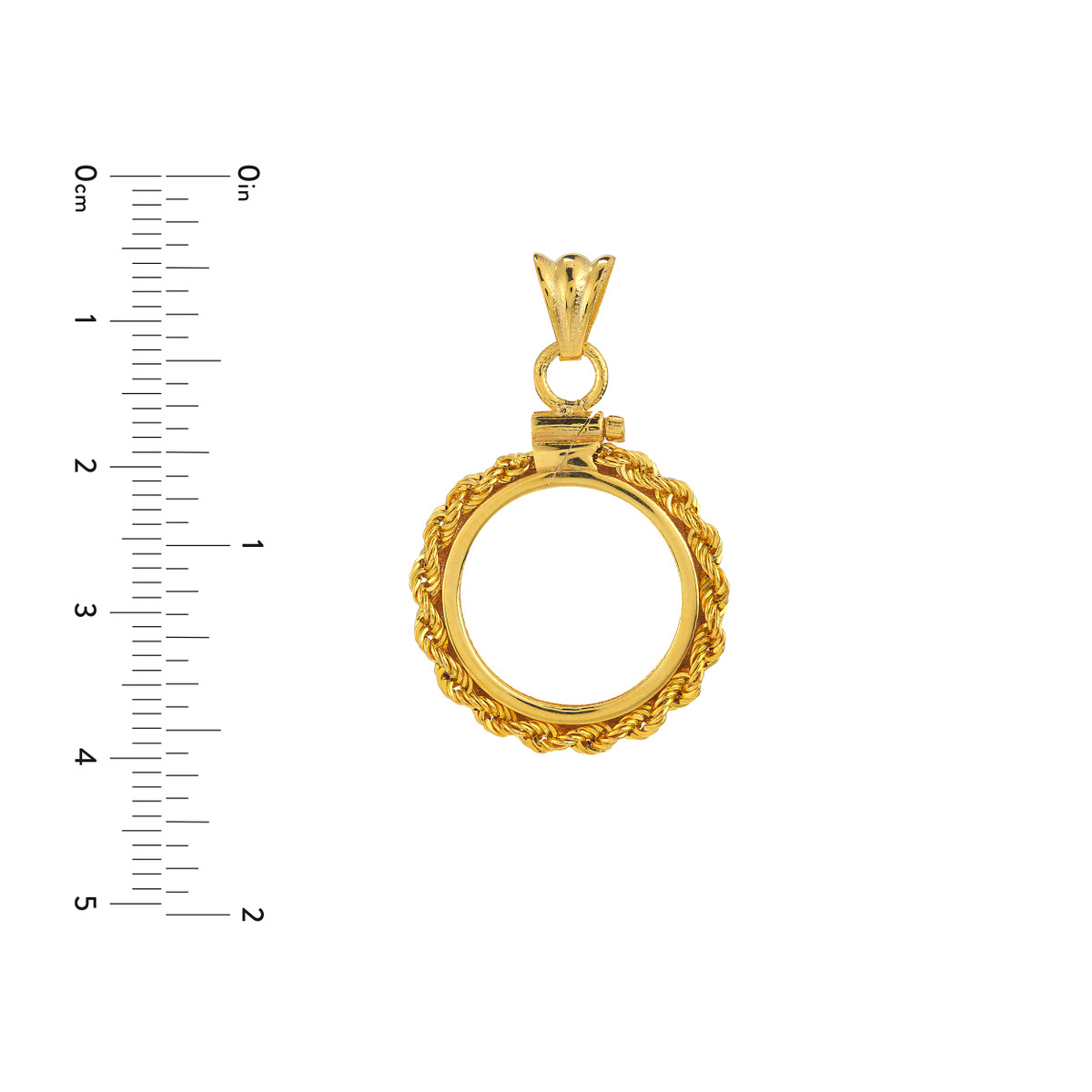Add a touch of boldness to your style with this stunning 14K yellow gold rope screw top bezel pendant. Perfectly designed to showcase your 1/10 oz American Eagle coin, this bezel is crafted with meticulous attention to detail. The rope design adds a classic and elegant touch, while the secure screw top ensures your coin is safe and secure.