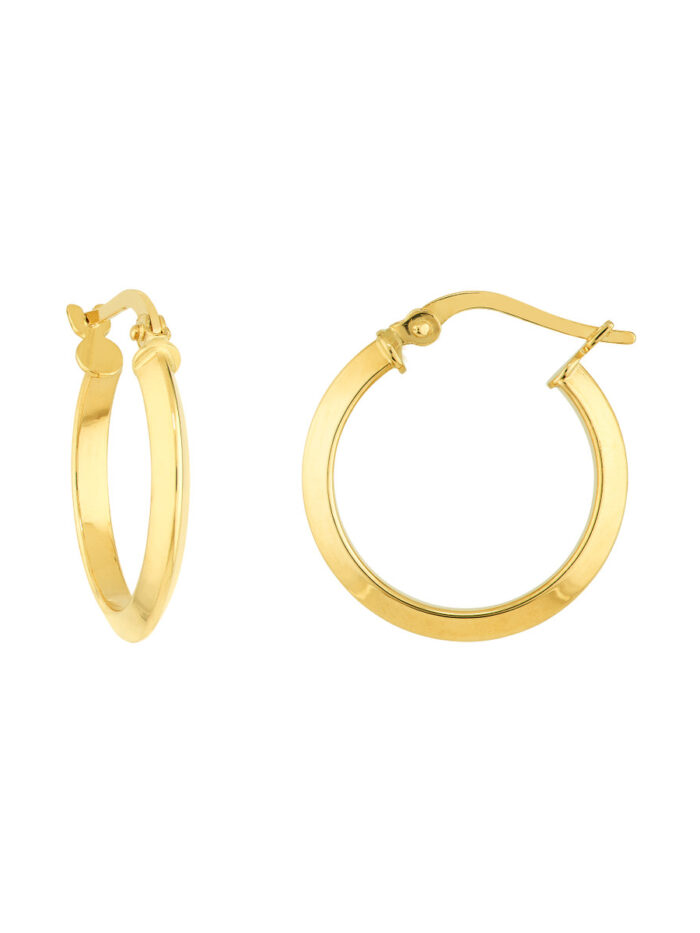 Elevate your everyday style with these chic small knife edge hoop earrings crafted from lustrous 14K yellow gold. Their simple yet modern design adds a touch of sophistication to any look. The secure hinge closure ensures they stay in place all day long.