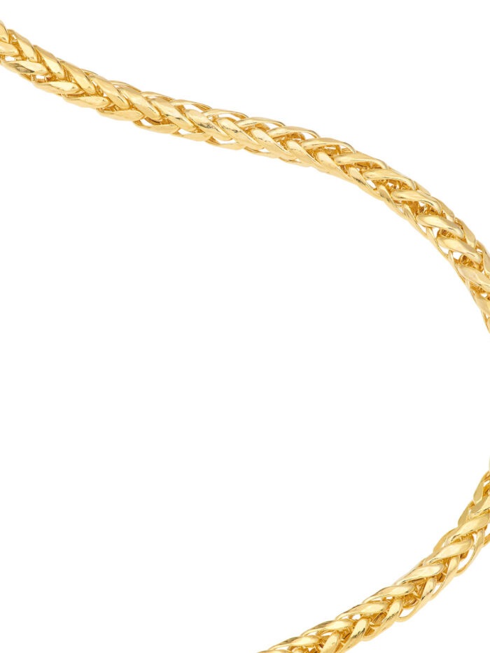 Elevate your style with this elegant 14K yellow gold spiga chain bracelet. The spiga chain design, with its intricate woven links, creates a captivating shimmer that adds a touch of sophistication to any look. The secure lobster lock closure ensures a comfortable and secure fit. Measuring 3.4mm in width and 7.5 inches in length, this bracelet is a versatile accessory for both casual and dressy occasions.