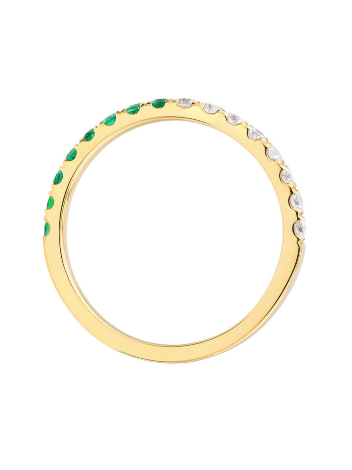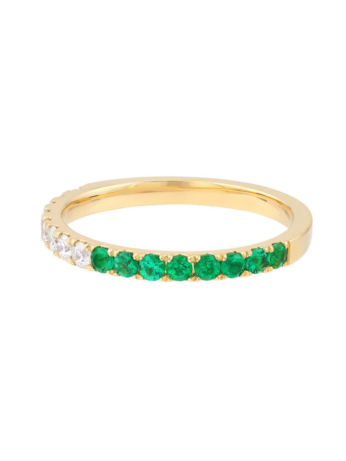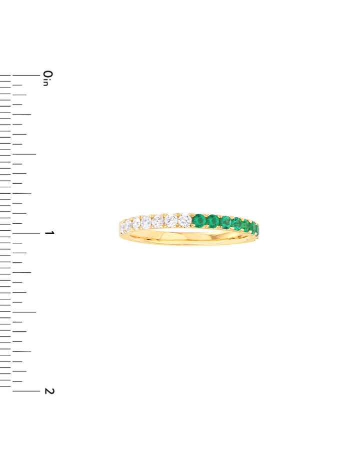 Celebrate a milestone with this stunning 14K yellow gold stackable band, featuring a unique alternating pattern of sparkling diamonds and vibrant emeralds. This timeless design adds a touch of elegance and individuality to your wedding ensemble. Crafted with care, this band is sure to become a treasured keepsake for years to come.