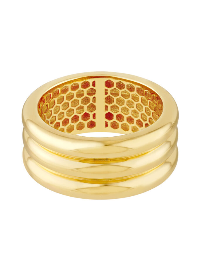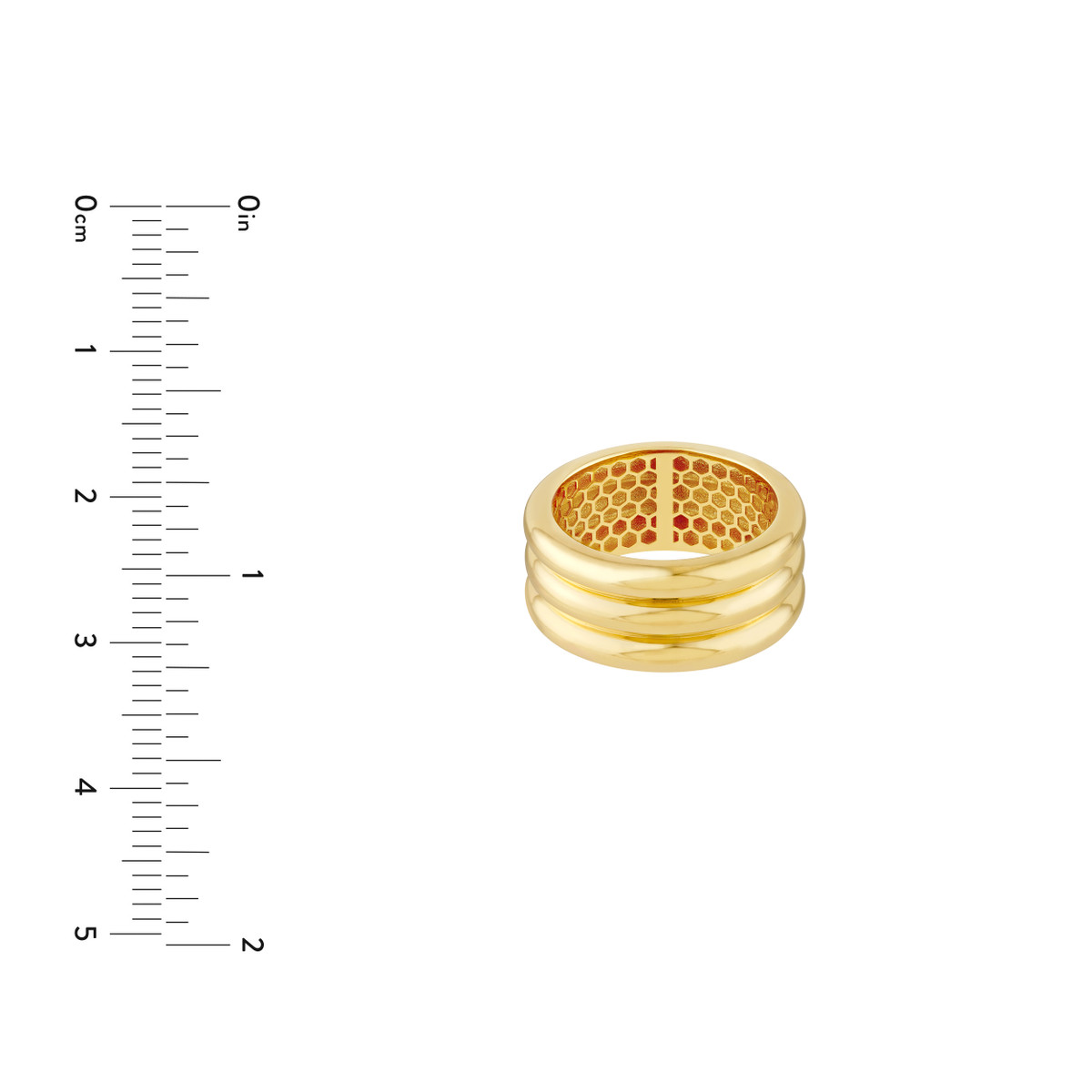 Make a statement with this eye-catching triple ridge band ring crafted in gleaming 14K yellow gold. The three distinctive ridges create a bold and modern look, perfect for stacking with other rings or wearing solo. This versatile band ring adds a touch of sophistication to any occasion, making it an ideal choice for those seeking a unique and stylish accessory.