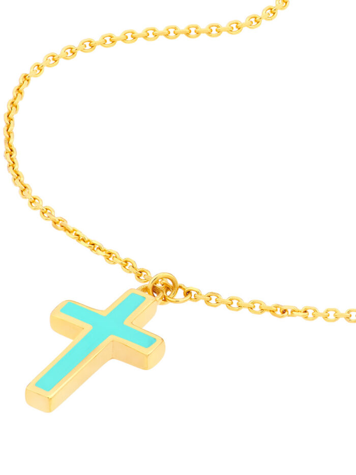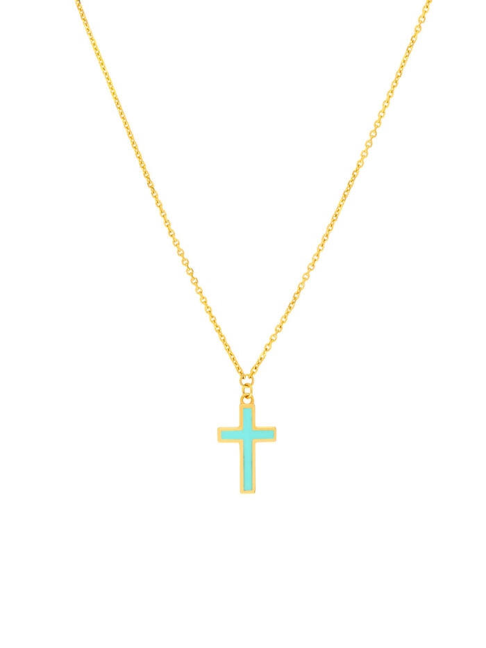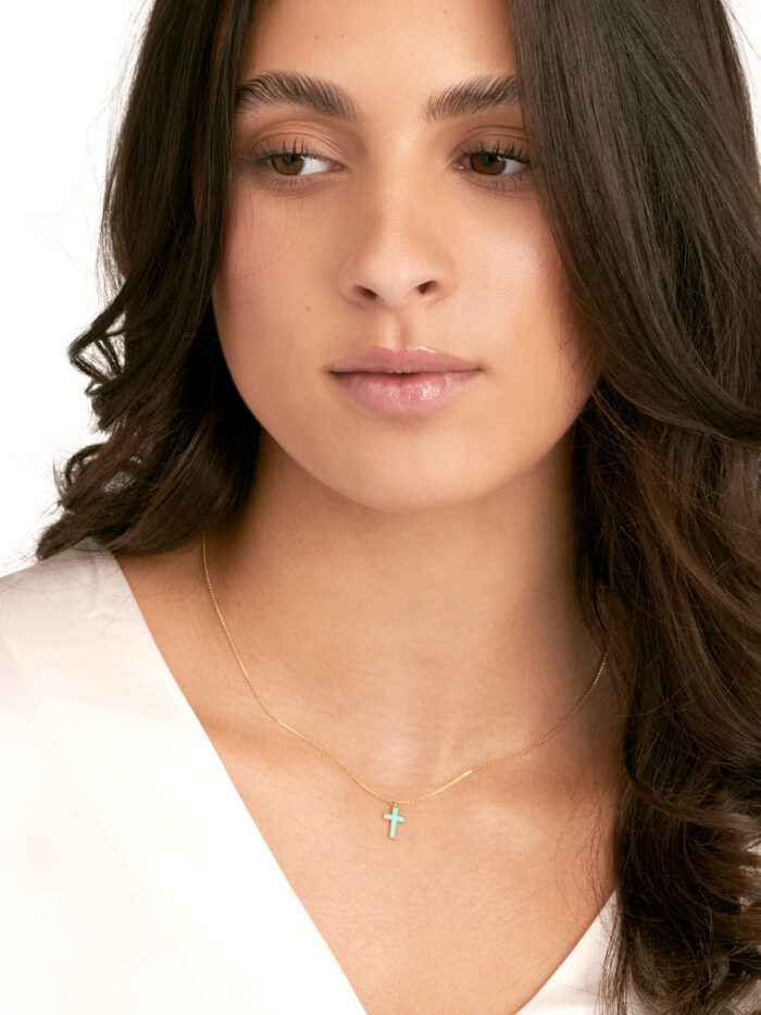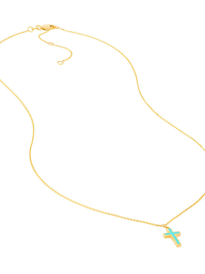 Embrace the timeless elegance of our turquoise cross pendant necklace. Crafted from lustrous 14K yellow gold, this piece features a captivating turquoise cross pendant, symbolizing faith and hope. The adjustable cable chain ensures a comfortable and stylish fit.
