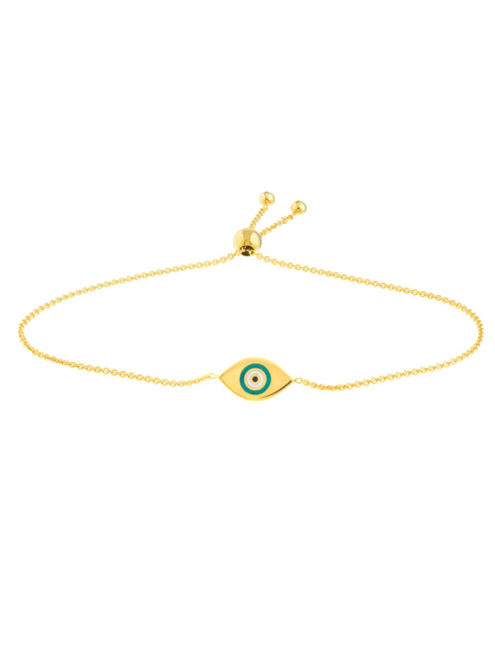 Add a touch of bohemian charm to your style with our 14K Yellow Gold Turquoise Evil Eye Bolo Bracelet. This dainty bracelet features a captivating turquoise enamel evil eye, symbolizing protection and good luck. Crafted in gleaming 14K yellow gold, the bolo closure offers a secure and adjustable fit. With its delicate design and meaningful symbolism, this bracelet is a unique and beautiful addition to any collection.