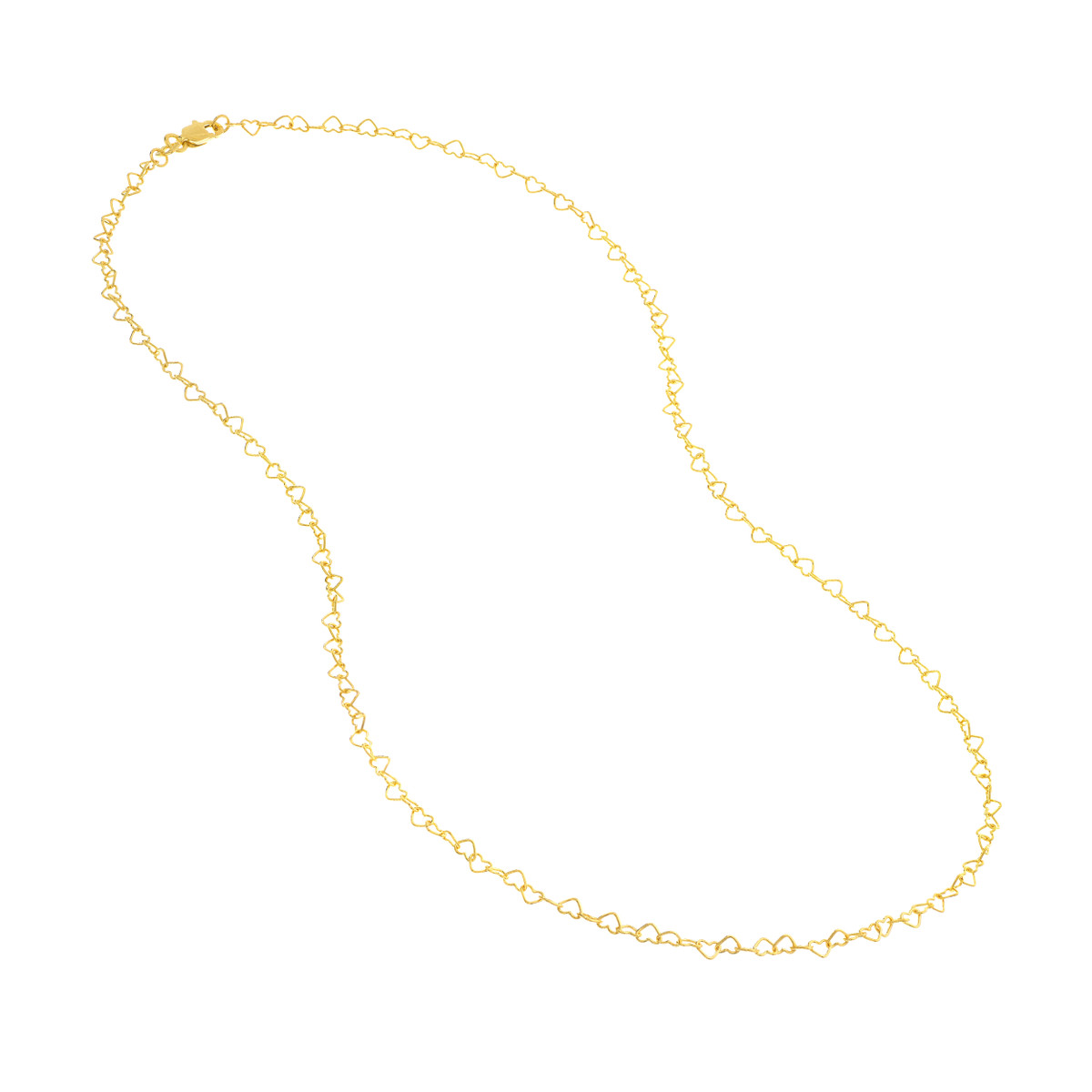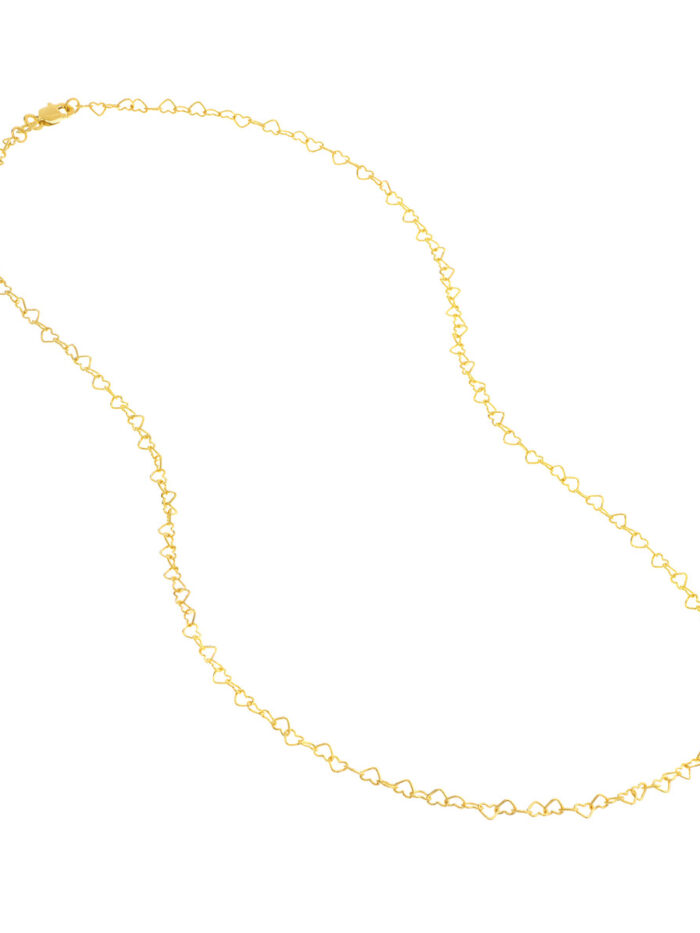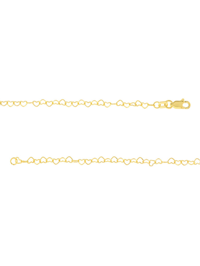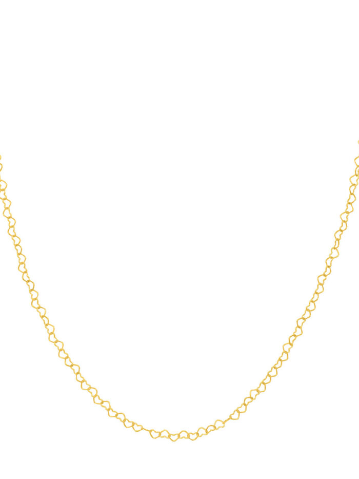 Add a touch of elegance and whimsy to your look with the 14K Yellow Gold Twist Heart Chain. This stunning necklace features interlocking heart links, measuring 3.5mm in width, creating a beautiful and sophisticated design. The lobster clasp closure ensures a secure and comfortable fit. Wear it alone for a delicate touch or layer it with other necklaces for a more personalized style.