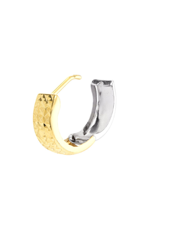 These two-tone 14K gold huggie hoop earrings offer the versatility to wear them in two distinct styles. Switch between the warm glow of yellow gold or the cool elegance of white gold for a look that matches your mood. The secure hinge closure ensures they stay comfortably in place all day long.