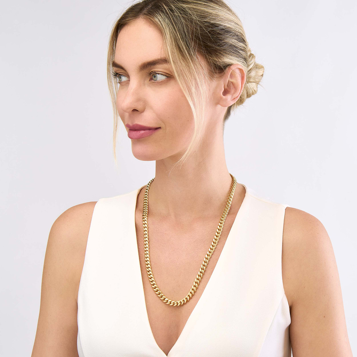 Make a statement with our dazzling 18K yellow gold Miami Cuban chain. This iconic style, known for its bold, twisted links, exudes luxury and confidence. Crafted to perfection with a secure lobster lock closure, this 9-inch chain adds a touch of glamour to any outfit.