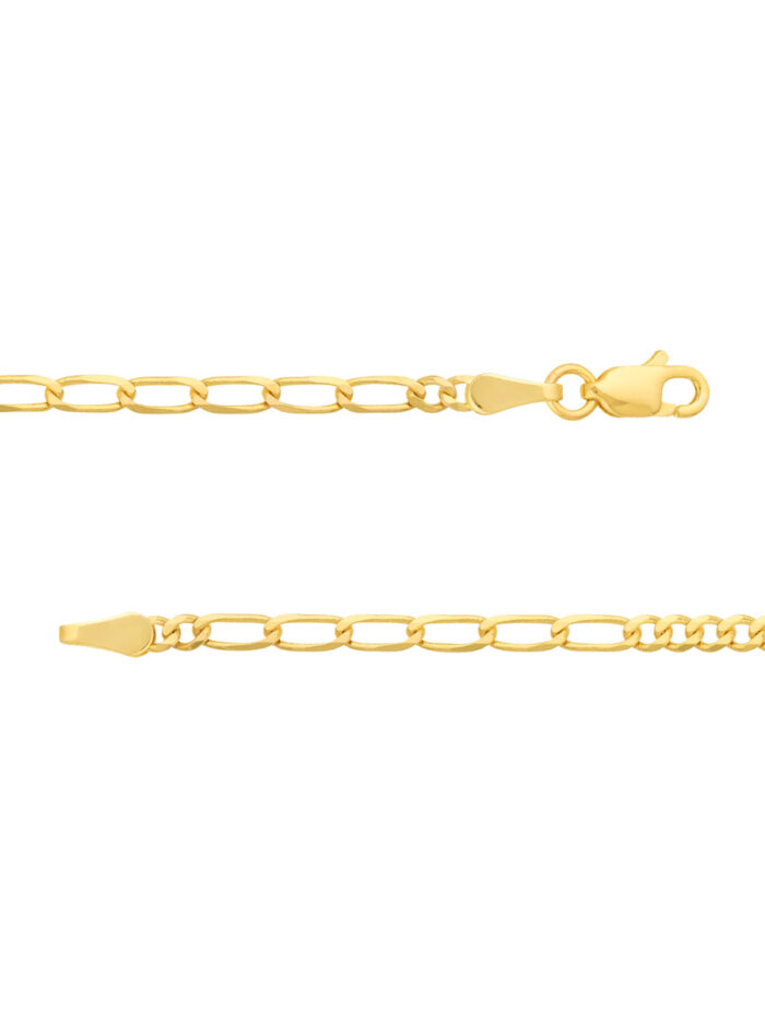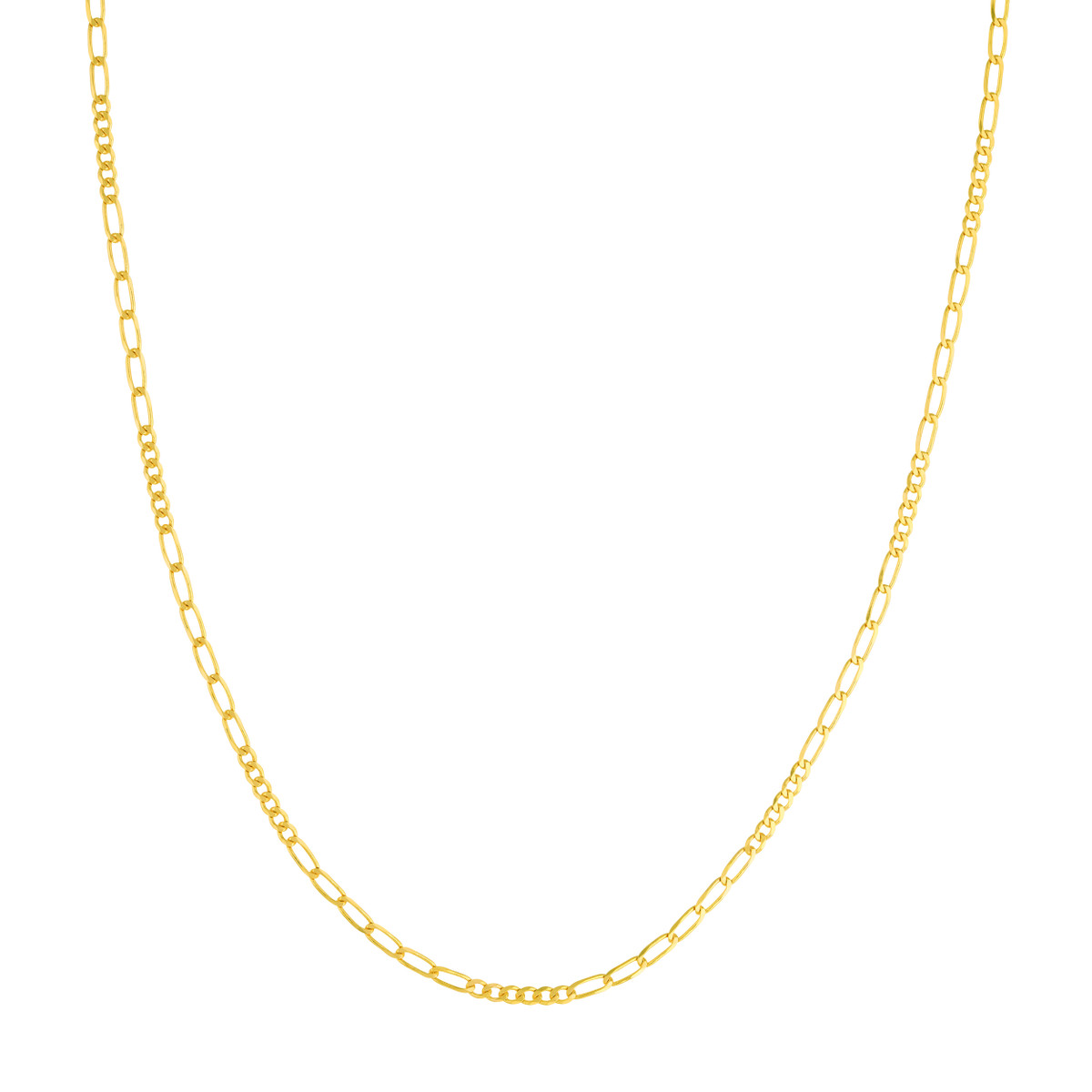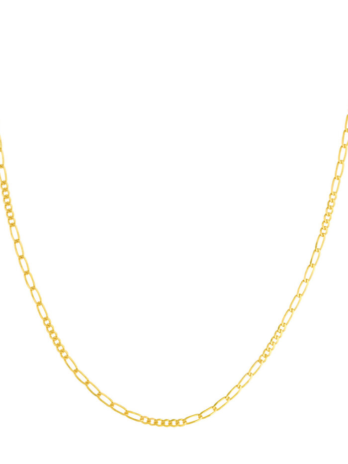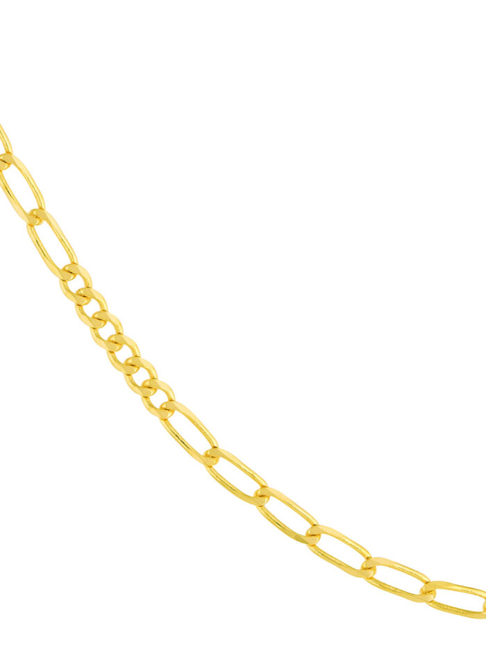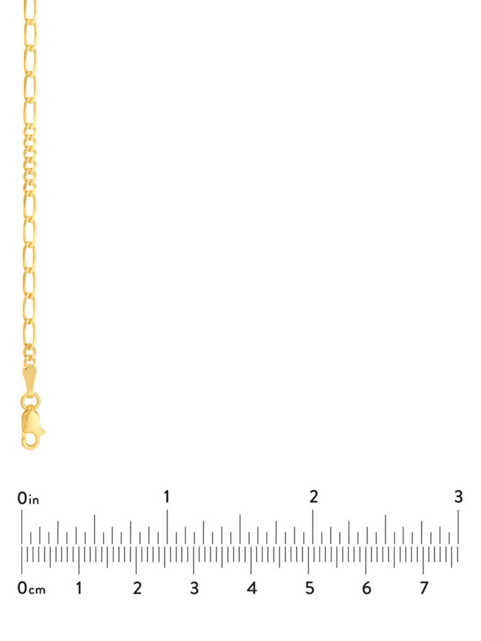 Add a touch of sophistication to your look with our 2.35mm Figaro chain necklace. Crafted from lustrous 14K yellow gold, this necklace features a classic Figaro design, alternating between oval and flat links for a timeless and elegant look. The secure lobster clasp ensures a comfortable and confident fit. Measuring 18 inches in length, it drapes beautifully and can be worn alone or layered with other necklaces for a personalized touch.