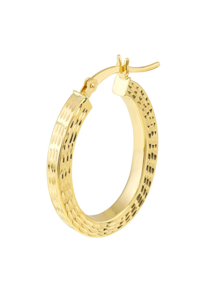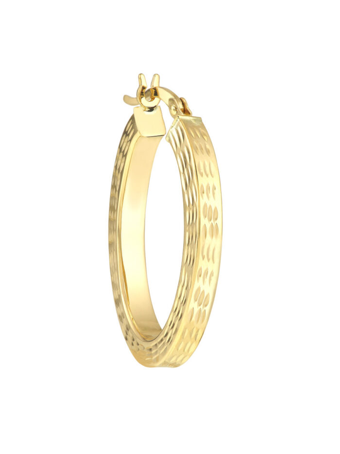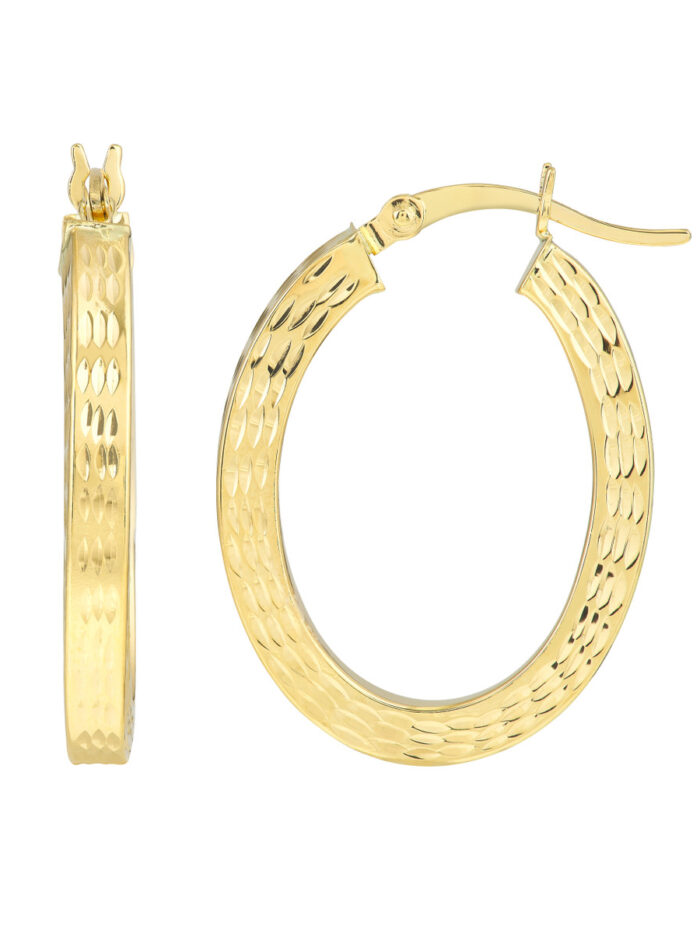 Add a touch of fun and style to your look with these 25mm Square Tube D/C Oval Hoop Earrings. Crafted from 10K yellow gold, these earrings feature a captivating diamond cut finish, ensuring they catch the light beautifully. The comfortable and secure hinged closure makes them perfect for everyday wear.