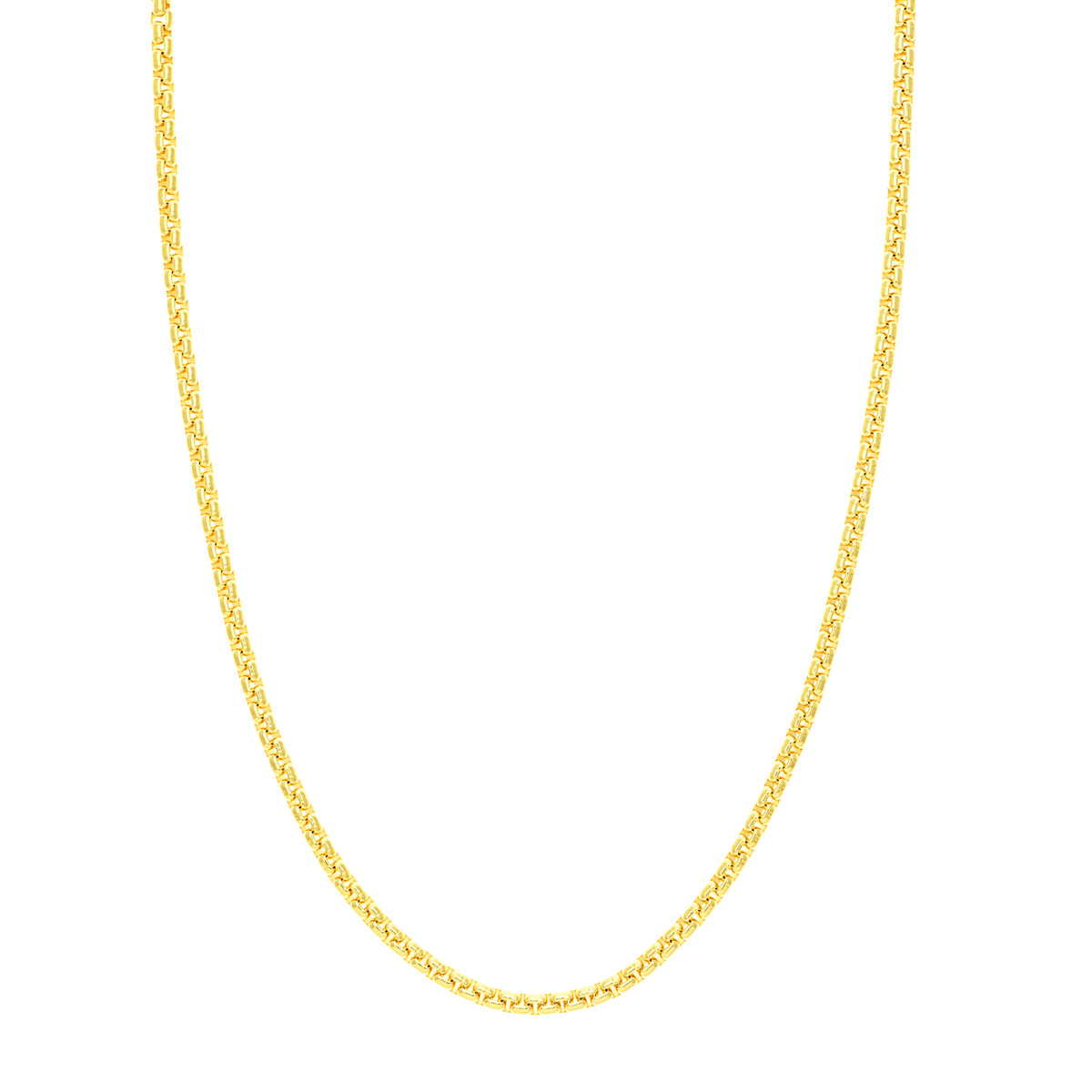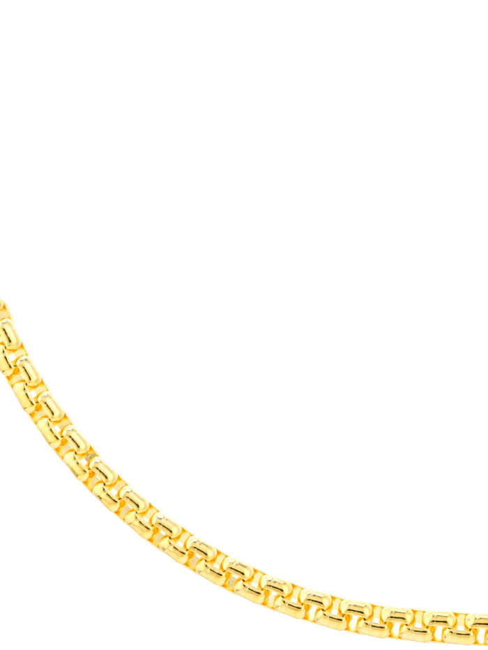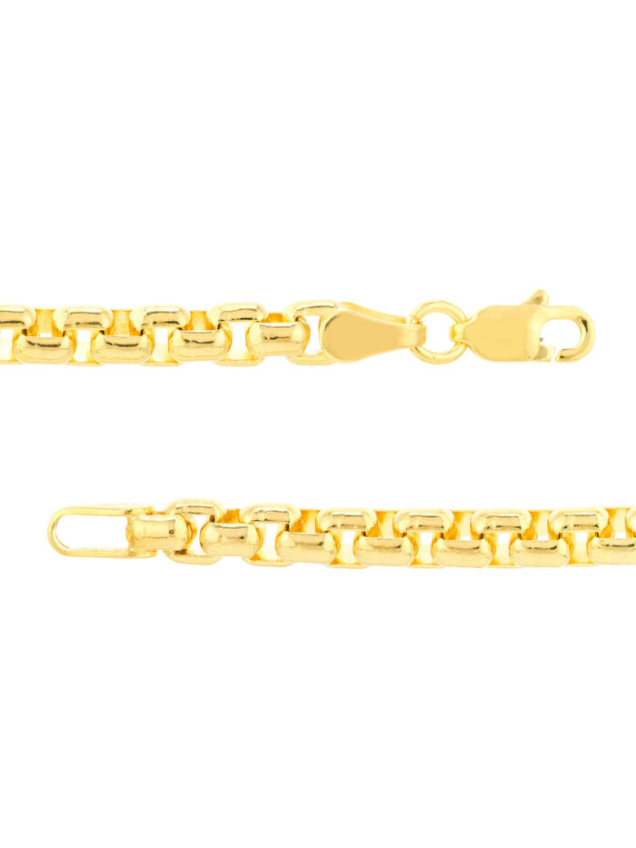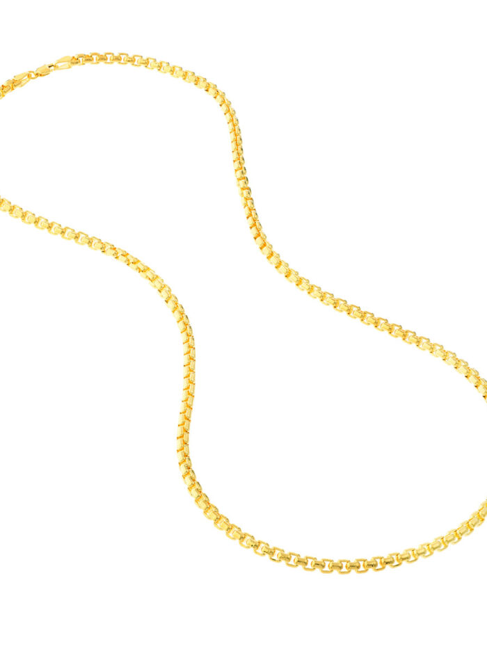 Make a bold statement with the 3.95mm Solid Round Box Chain. This sturdy and distinct chain is crafted from lustrous 14K yellow gold, measuring 3.95mm wide for a striking look. The secure lobster clasp ensures comfort and ease of wear, while the 18-inch length provides versatility. This chain is a timeless classic that complements any style, adding a touch of elegance to your everyday look.