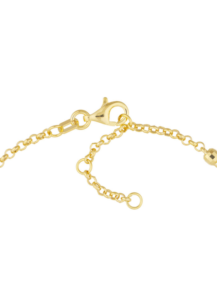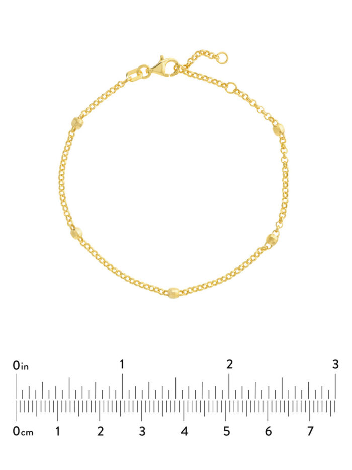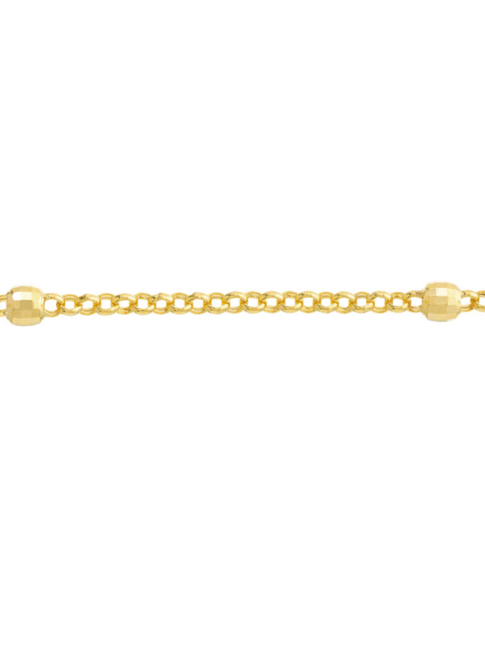 The 3mm D/C Bead Station Bracelet is a stylish and versatile accessory. Crafted in gleaming 14K yellow gold, it features 3mm diamond cut beads on a classic rolo chain. The adjustable design allows for a personalized fit, while the eye-catching beads add a touch of sparkle to any outfit.