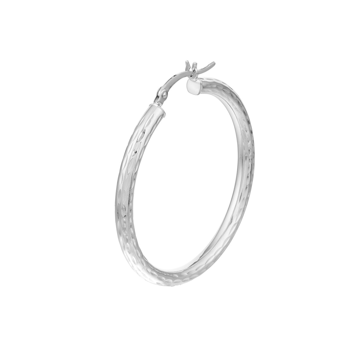 Shine bright with these elegant 3 x 35mm full diamond-cut hoop earrings. Crafted from lustrous 14K white gold, their design features a captivating diamond-cut texture that catches the light beautifully. The timeless hoop shape complements any outfit, adding a touch of sophistication to both casual and formal occasions. The secure hinge closure ensures comfortable wear all day long.