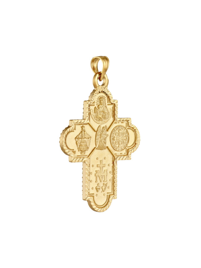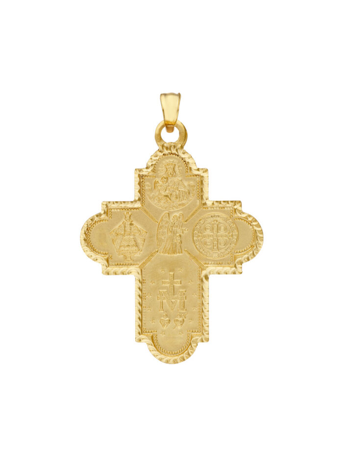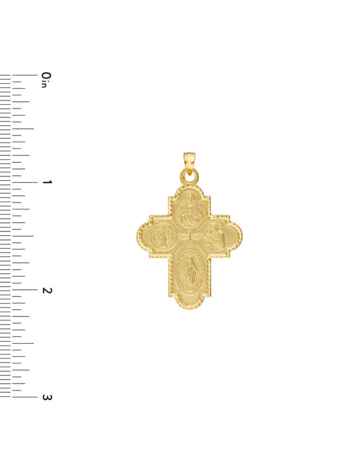 This intricately designed 4-way double-sided medal cross pendant embodies faith and devotion. Crafted in 14K yellow gold, it features captivating imagery on both sides, showcasing the Sacred Heart of Jesus and Carmel Mary, St. Benedit, St. Joseph, St. Nino De Cebu, and Holy Mary. The secure bail closure allows for easy attachment to a chain of your choice, making it a meaningful and stylish addition to your collection.